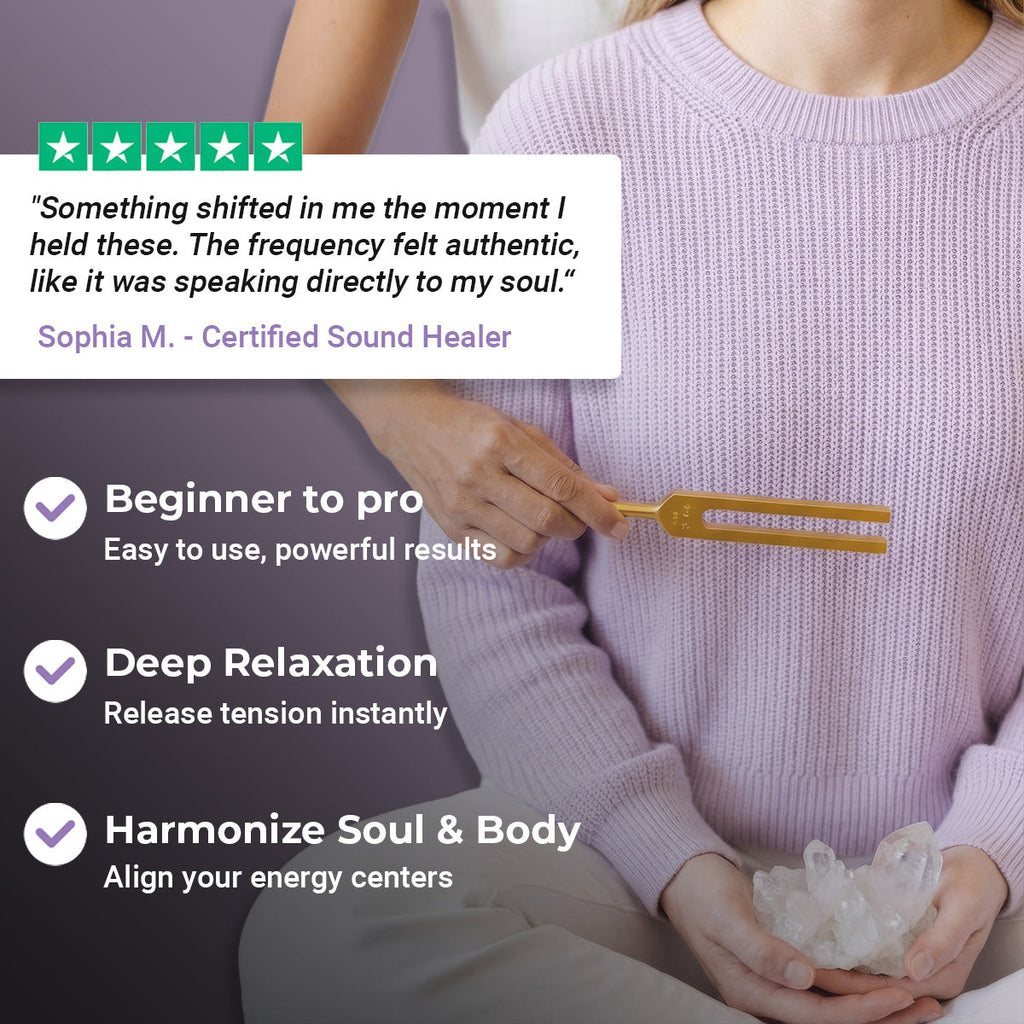 Das Solfeggio Weighted Set (9 Gabeln) kombiniert die 6 ursprünglichen heiligen Töne (396–852 Hz) mit 3 zusätzlichen Frequenzen (174, 285, 963 Hz) für umfassende Heilanwendungen – von der Schmerzlinderung bis zur spirituellen Verbindung.