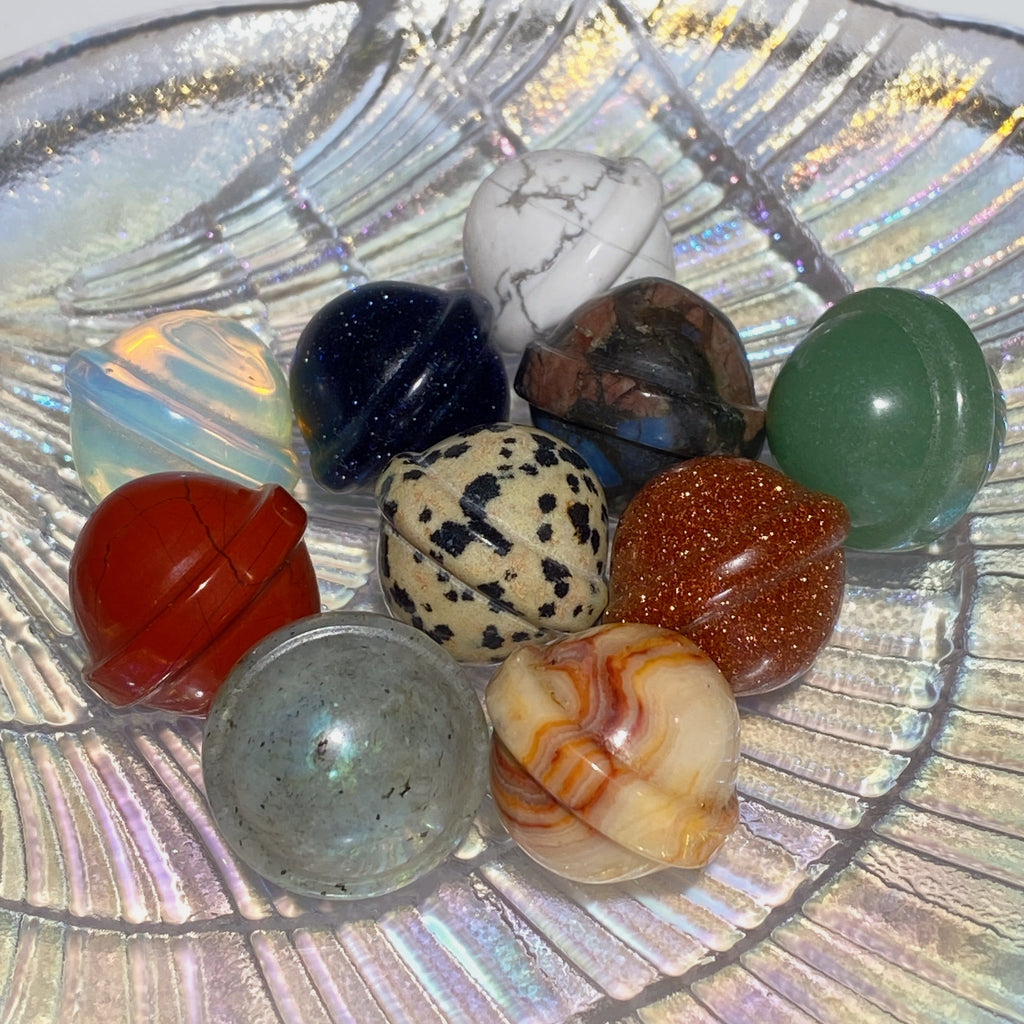 Our 20mm mixed spheres include Labradorite, Crazy Agate, Howlite, Red Que Sera, Blue Sandstone, Red Jasper, Dalmatian, Golden Sandstone, Green Aventurine, and Opalite, each offering unique energetic benefits.