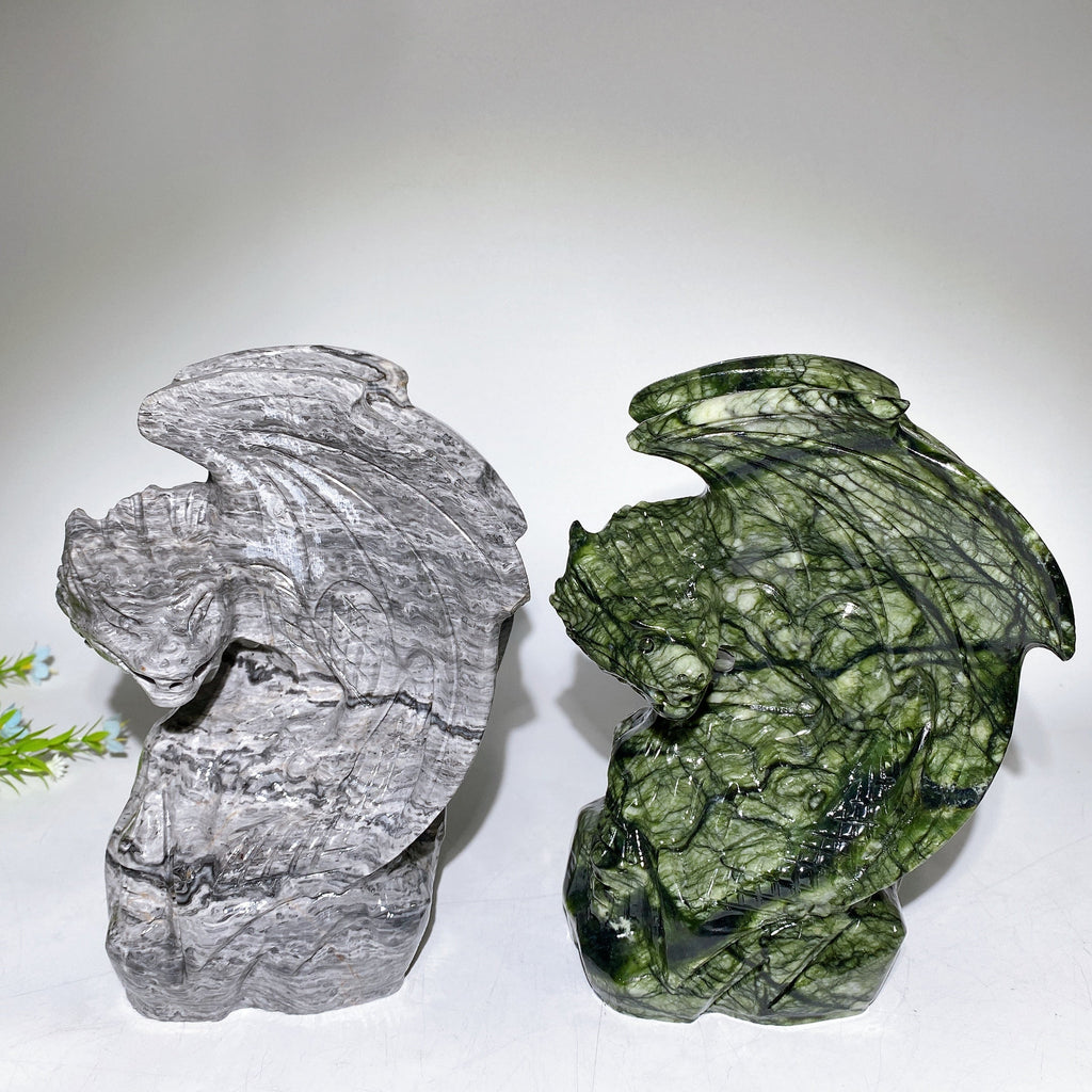 Die Drachenschnitzerei aus Picasso-Stein bietet erdende Energie und fördert die Kreativität, während die Serpentin- Variante beruhigende und schützende Eigenschaften mit sich bringt. Beide fördern durch ihre einzigartigen Kristallenergien die spirituelle Verbindung und das Gleichgewicht.