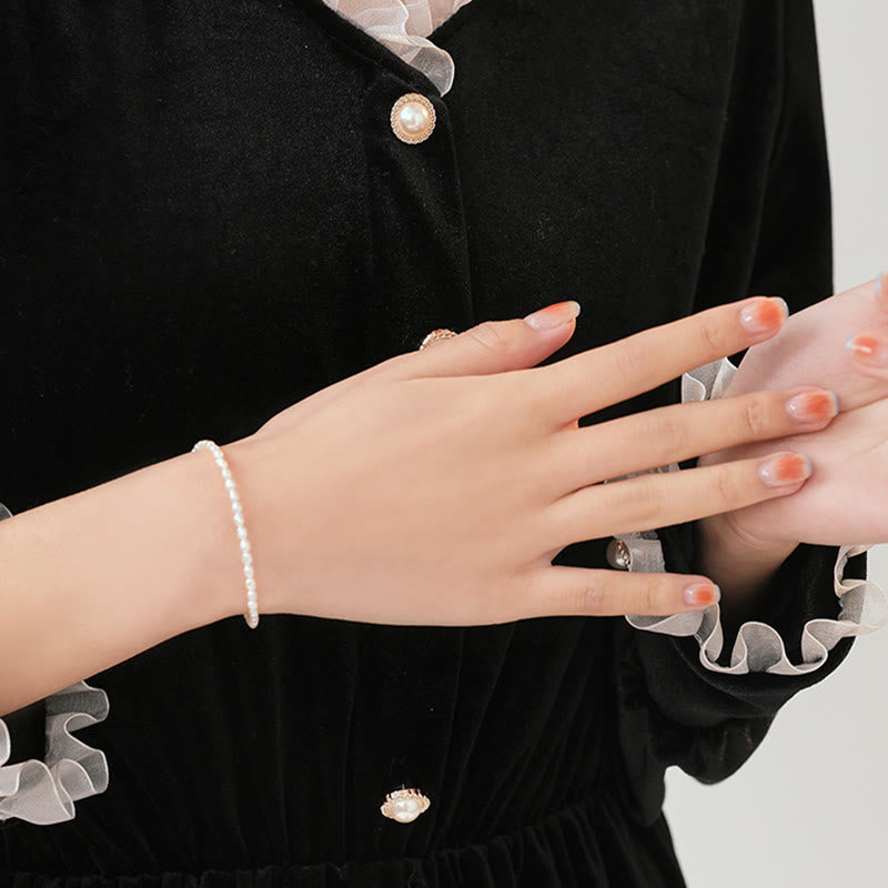 Dieses Armband ist in den Handgelenkumfängen 5,9 Zoll (ca. 15 cm) und 6,3 Zoll (ca. 16 cm) erhältlich. Es besteht aus 2 mm (ca. 0,08 Zoll) oder 3 mm (ca. 0,12 Zoll) großen Naturperlen und kann mit einer Verlängerungskette für eine individuelle Passform ergänzt werden.