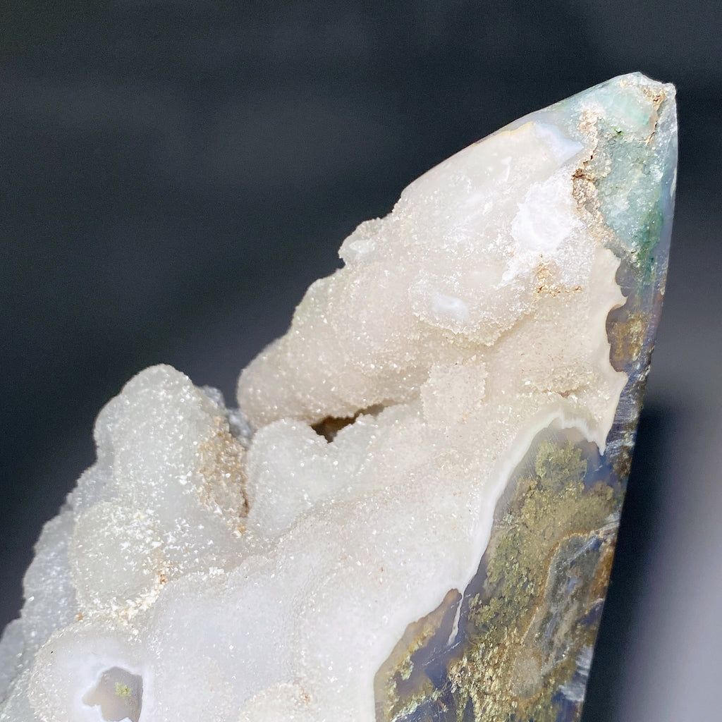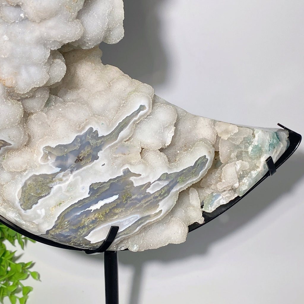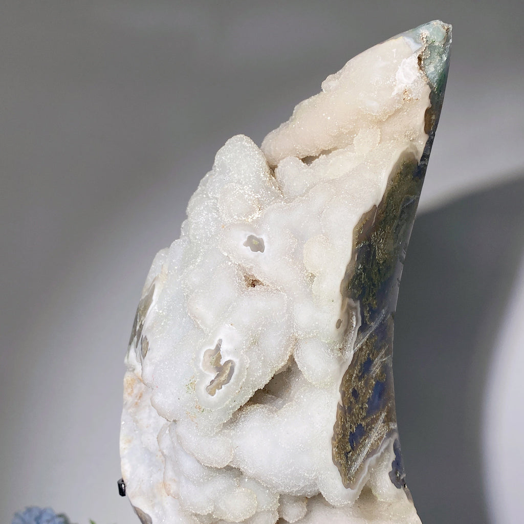 Die Drusen-Moosachat-Mondschnitzerei fördert emotionales Gleichgewicht und spirituelles Wachstum. Bekannt für ihre nährende Energie, hilft sie, Ihr Inneres und Ihre Umgebung zu harmonisieren und ist daher ein wunderbares Werkzeug für Meditation und Heilrituale.
