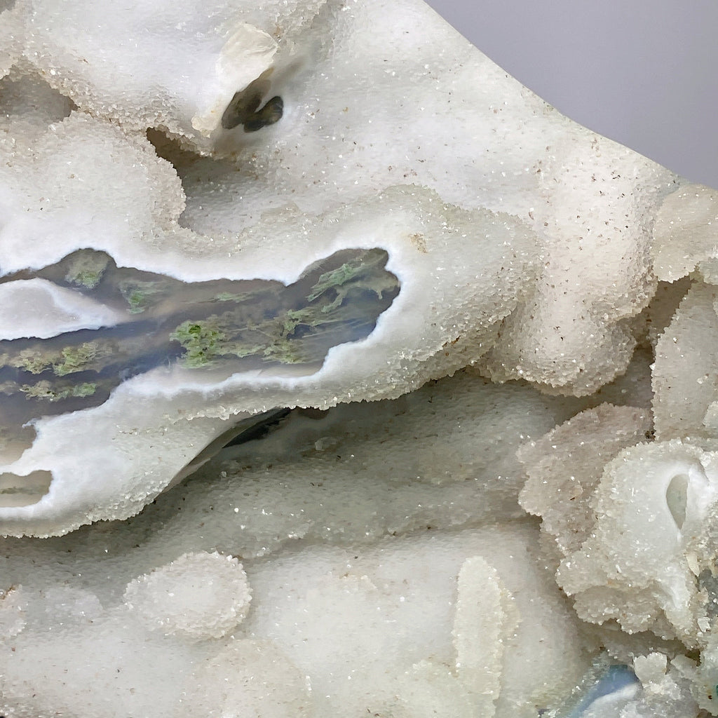 Ja, dieses Stück ist aus echtem Drusenmoosachat gefertigt und weist natürliche Mineraleinschlüsse und einzigartige Muster auf. Jede Schnitzerei ist einzigartig und unbearbeitet, wodurch die raue Schönheit und die energetischen Eigenschaften des Steins erhalten bleiben.