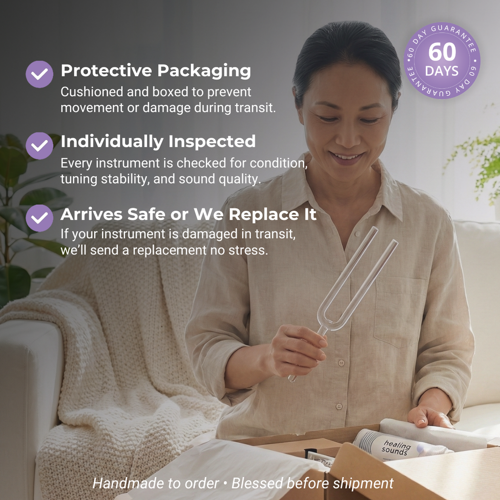 Jede Stimmgabel aus Kristall wird auf Bestellung handgefertigt , um höchste Handwerksqualität und präzises Stimmen zu gewährleisten. Dieser handwerkliche Prozess garantiert ein Instrument, das den höchsten Standards der Klangheilung entspricht.