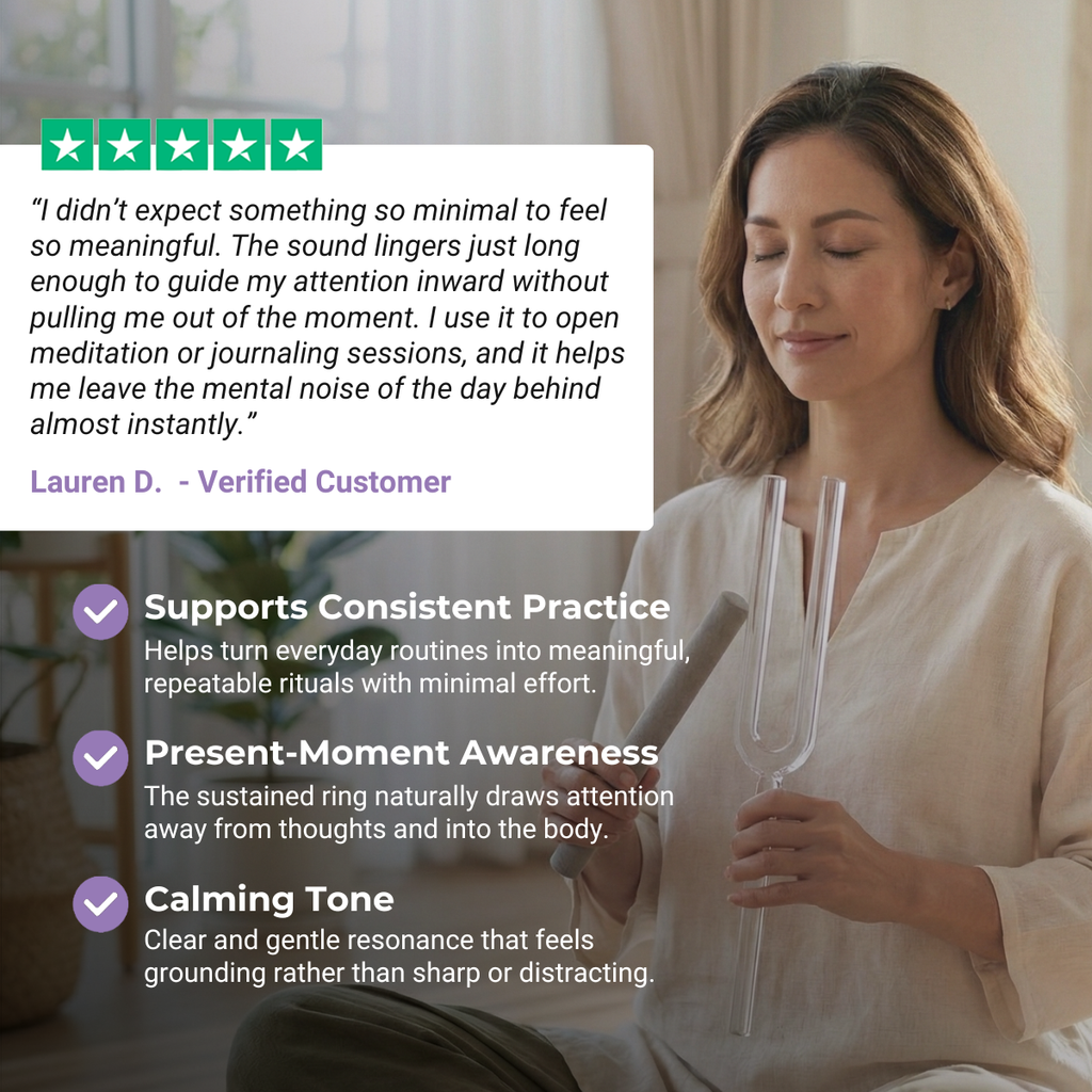 Im Gegensatz zu herkömmlichen Stimmgabeln aus Metall bestehen unsere Stimmgabeln aus Kristall aus 99,99 % reinem Quarz und erzeugen eine weichere, resonantere Schwingung.