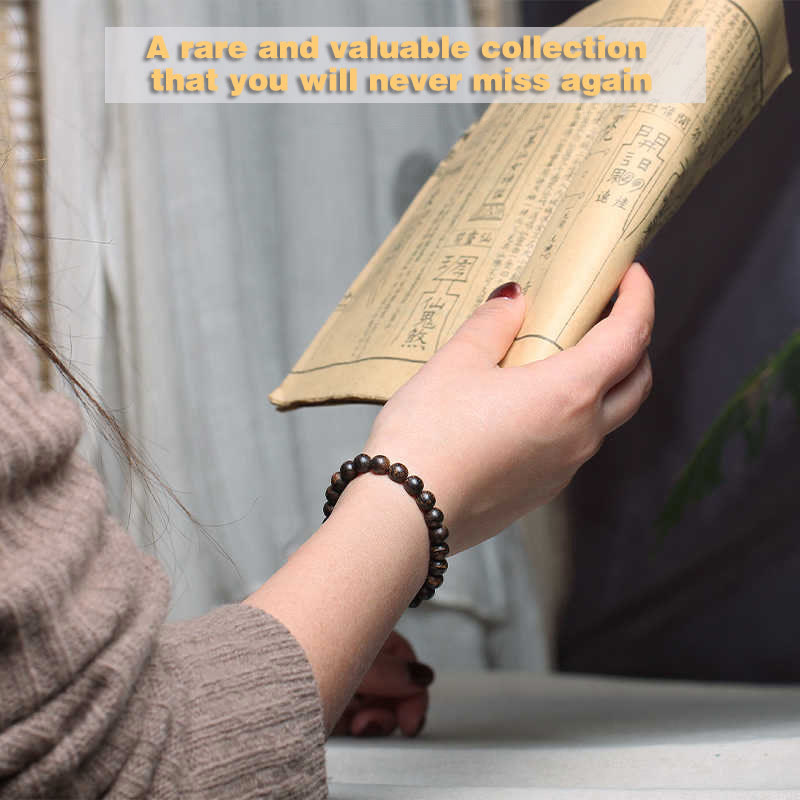 Das Material dieses Armbands ist das sogenannte „schwarze Perlen“-Adlerholz, das sich durch seinen außergewöhnlichen Ölgehalt und sein unverwechselbares Aromaprofil auszeichnet. Bei Erwärmung durch Körperwärme setzt es subtile Noten frei, die als süß, holzig und komplex beschrieben werden.