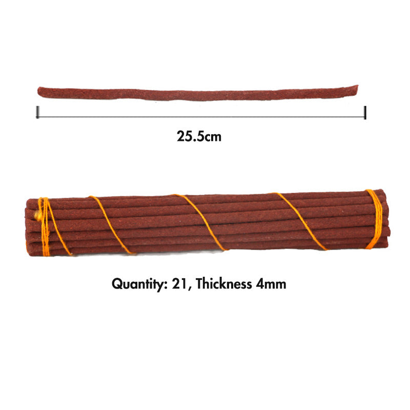 Each incense stick measures approximately 25.5 cm (10 inches) long and 0.4 cm (0.16 inches) in diameter. The pack contains 21 hand-made sticks, ideal for multiple meditation or relaxation sessions.