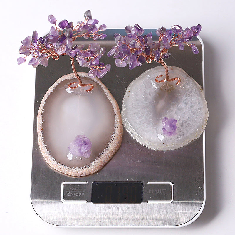 Yes, this tree is crafted with genuine amethyst chips and rests on a natural agate slice base, ensuring authenticity and quality in each handmade piece.