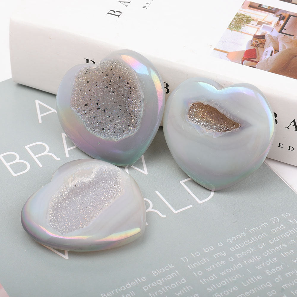 The Aura Angel Crystal Druzy Agate Hearts support emotional healing and promote love and compassion. Their gentle energy is ideal for balancing the heart chakra and enhancing meditation practices, bringing peace and positive energy into your daily life.