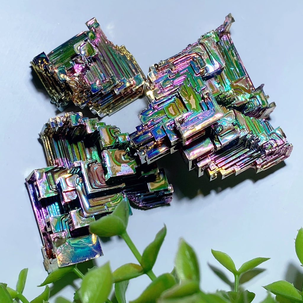 The iridescent colors come from the unique aura treatment of the bismuth crystal, creating vibrant green, gold, pink, and blue hues. Each crystal is unpolished and naturally shaped, making every piece distinct and authentic.