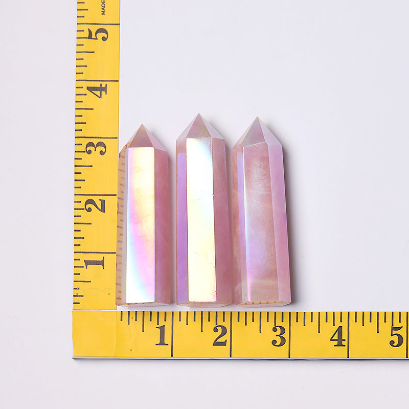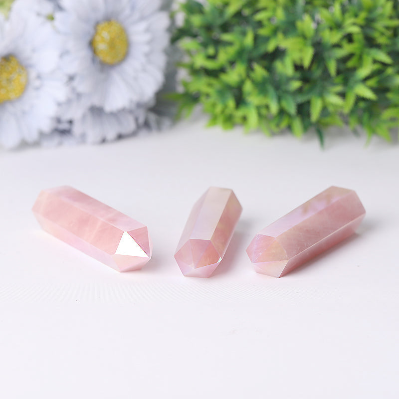 To keep your rose quartz points vibrant and energetically clear, gently wipe them with a soft, dry cloth. Avoid prolonged water exposure to preserve the aura finish and crystal integrity. Store them in a safe, peaceful space.