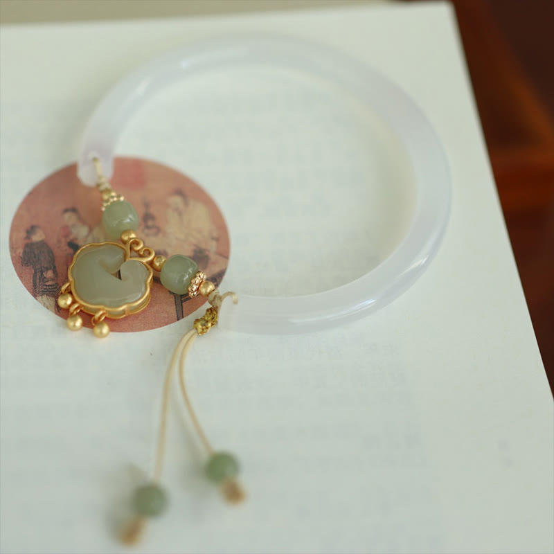 Das Ruyi-Schloss-Designelement aus Hetian-Jade symbolisiert Harmonie und Glück und macht dieses Armband besonders geeignet für diejenigen, die Wohlstand und Fülle in ihrem Leben steigern möchten. Die Jadekomponente fördert eine positive Einstellung zu finanziellen Angelegenheiten und unterstützt gleichzeitig persönliches Wachstum und Entwicklung.