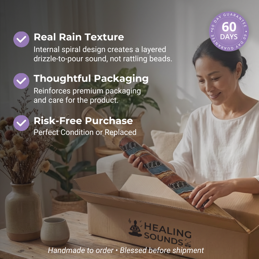 Jeder Regenstab wird sorgfältig aus hochwertigem Bambus und Holz gefertigt, was Langlebigkeit und einen satten, natürlichen Klang gewährleistet. Die handgemalten Punktmuster und die mit Holzkohle gebrannten Designs verleihen ihm eine künstlerische Note und machen ihn nicht nur zu einem Instrument, sondern zu einem wunderschönen Kunstwerk. Dank unseres Qualitätsanspruchs erhalten Sie ein optisch beeindruckendes und akustisch hochwertiges Produkt – perfekt für Musik, Theater oder Klangbäder. Die reinen, satten Töne des Regenstabs machen ihn ideal für Entspannungs- und Achtsamkeitsübungen oder als einzigartige Ergänzung für jedes musikalische Ensemble.