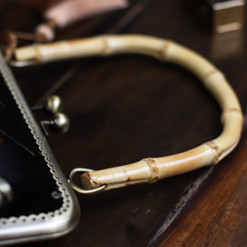 This handbag measures 8.86 inches (approx. 22.5 cm) wide, 6.69 inches (approx. 17 cm) high, and 3.35 inches (approx. 8.5 cm) deep. Its compact size with bamboo handles and a buckle closure makes it convenient and secure for daily or special occasion use.