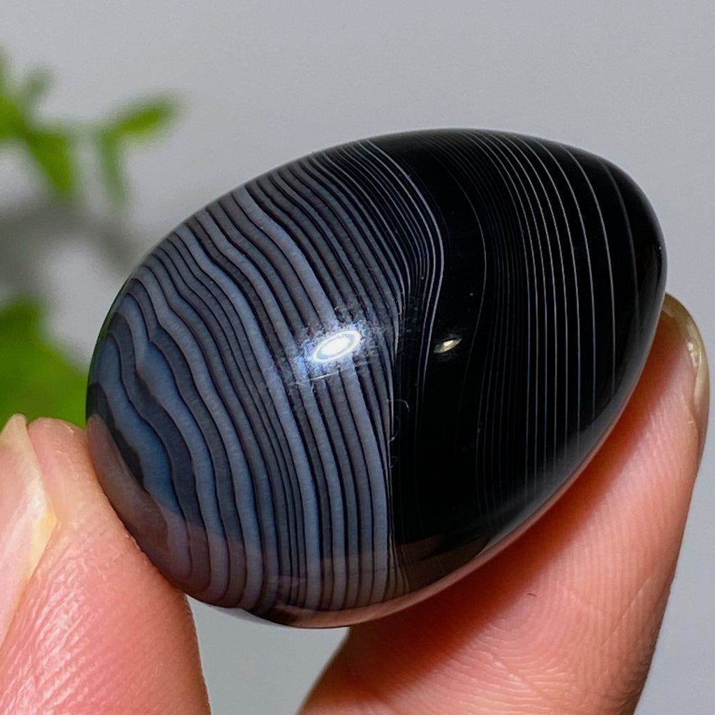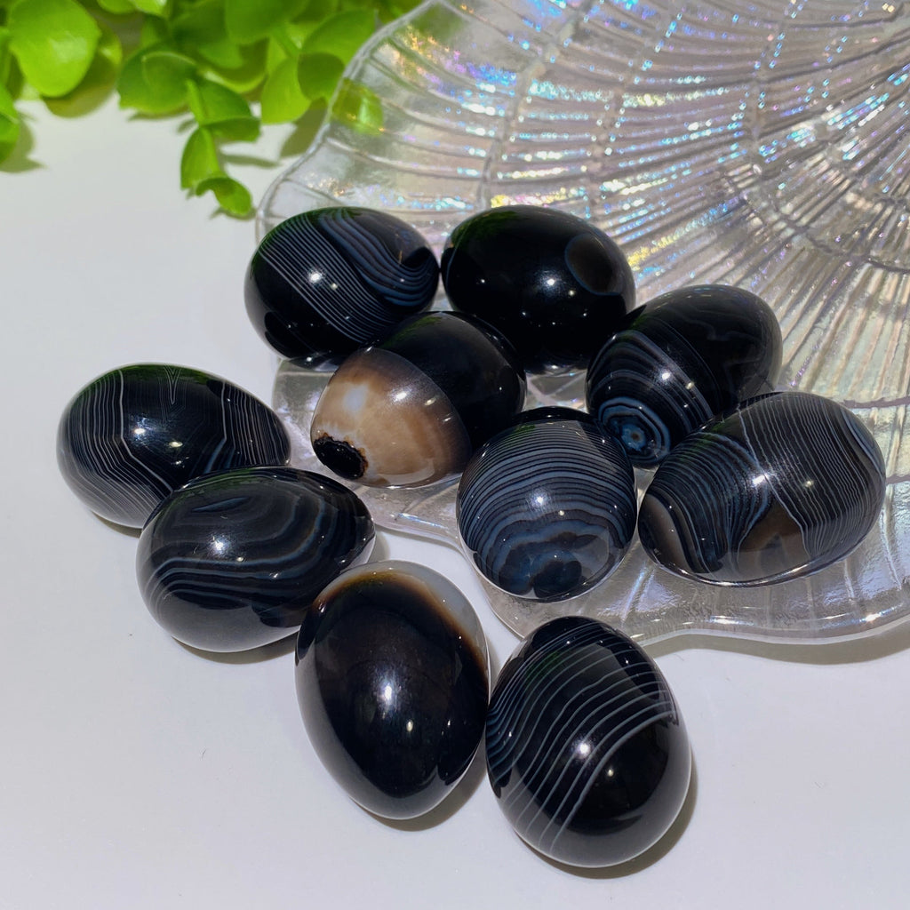 The black banded agate crystal egg carries grounding and protective energies. It is believed to enhance spiritual growth, balance energy, and offer emotional strength during meditation.