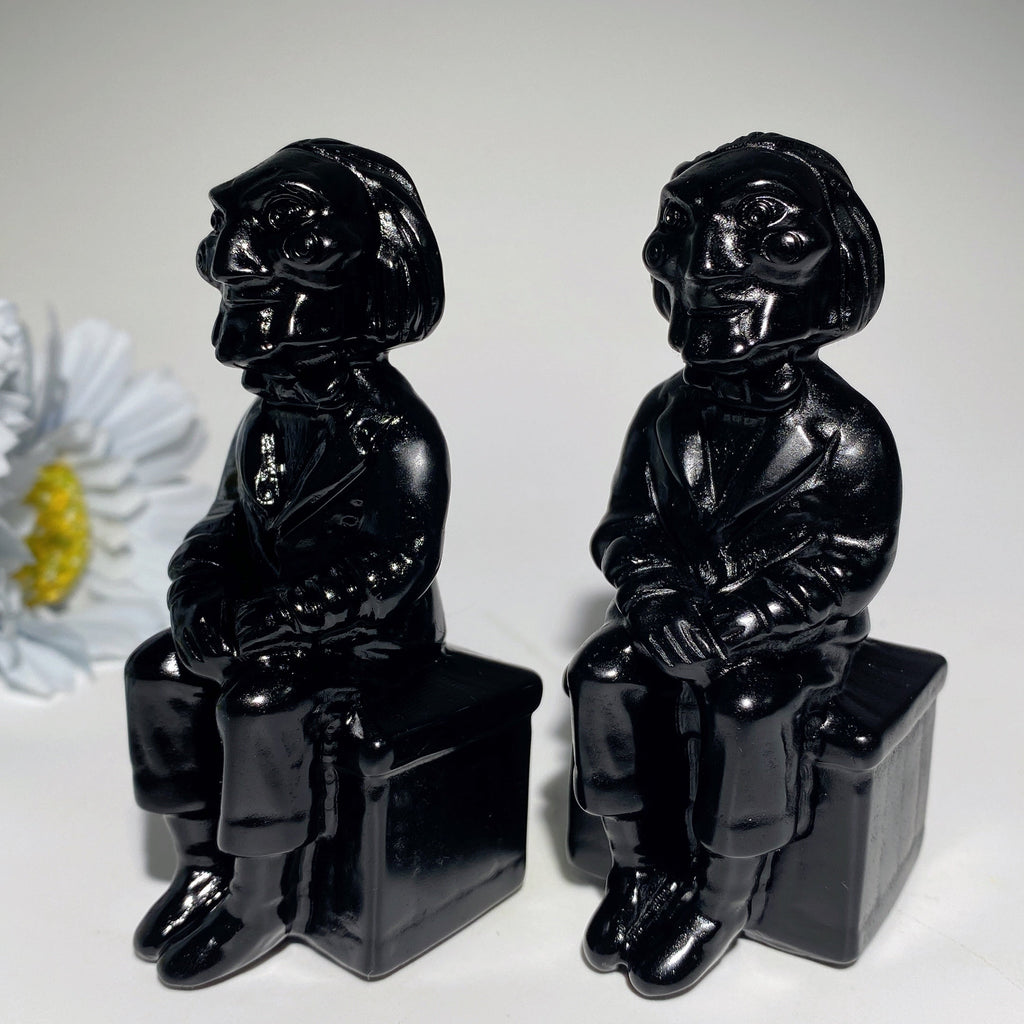Jede Figur aus schwarzem Obsidian hat eine humanoide Form mit komplexen Gesichtszügen und formeller Kleidung und sitzt auf einem quadratischen Sockel. Mit ihrer glänzenden, reflektierenden Oberfläche erzeugt diese handgeschnitzte Kristallstatue trotz ihrer kompakten Größe eine beeindruckende Präsenz.