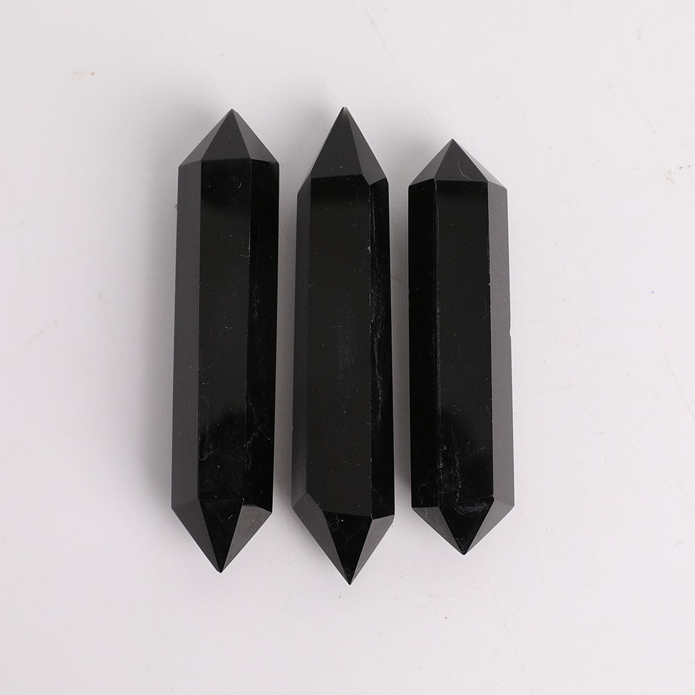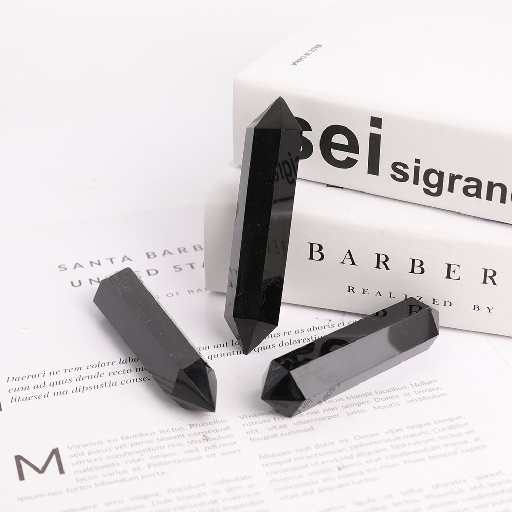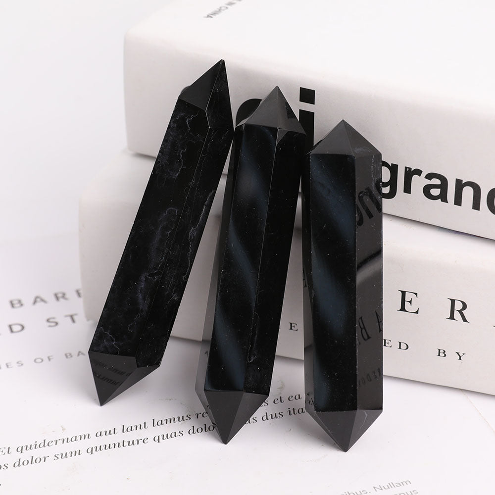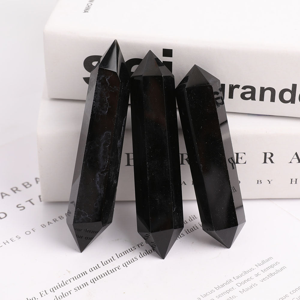 Black Obsidian double terminated points are valued for their powerful grounding and protective energies. Their dual terminations facilitate balanced energy flow, promoting spiritual clarity and transformation. They are excellent for clearing negative energies and enhancing meditation focus.
