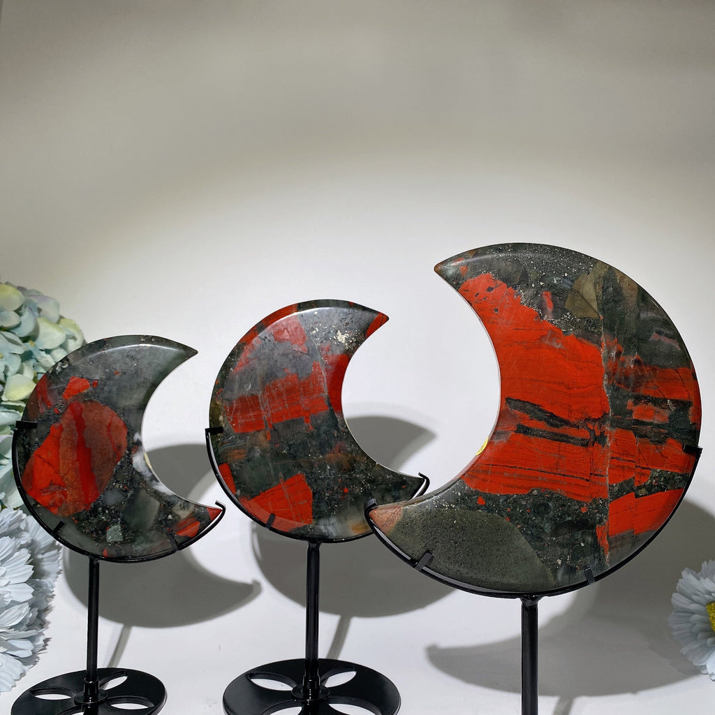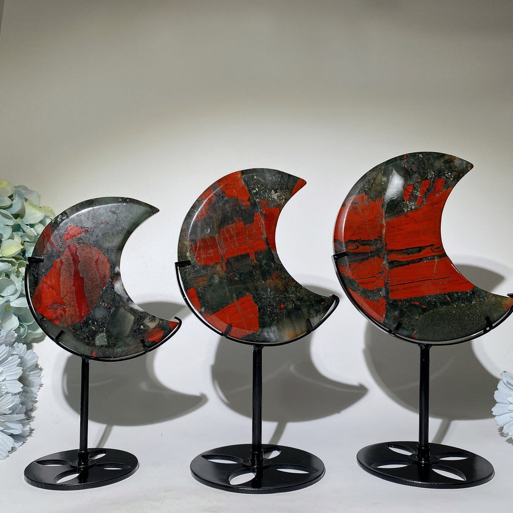 Dieser Blutstein-Kristallmond ist in den Größen 10–16 cm (ca. 3,94–6,3 Zoll) Länge erhältlich. Es gibt Varianten mit 10–11 cm, 12–13 cm und 13,5–15 cm, jeweils mit einem stabilen 8 cm (ca. 3,15 Zoll) langen schwarzen Metallständer für Stabilität.