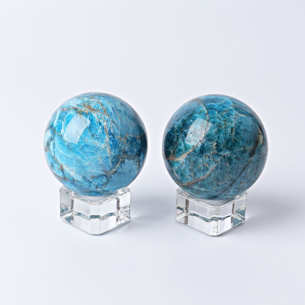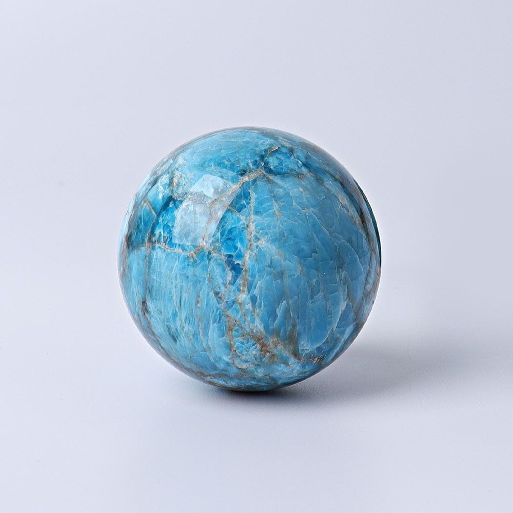 The Blue Apatite crystal sphere is well-known for promoting energy balance and enhancing meditation. It is believed to encourage clarity, self-expression, and spiritual growth, making it a powerful tool for healing and mindfulness practices.