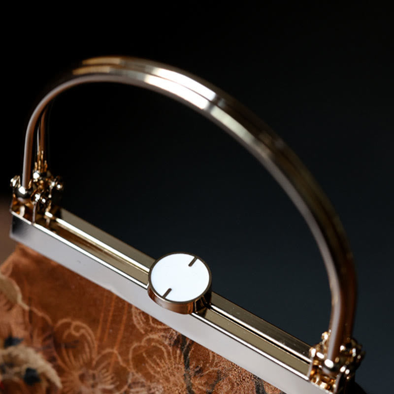 Der markante Metallgriff macht diese Yogatasche aus Canvas zu etwas ganz Besonderem. Der robuste Metallrahmen mit einer Höhe von 10 cm bietet bequemen Halt, egal ob Sie morgens zum Vinyasa gehen oder am Wochenende Besorgungen machen. Die edle braune Stoffaußenseite zeigt dezente Blattmuster, die Ihren Yoga-Accessoires einen Hauch natürlicher Harmonie verleihen.