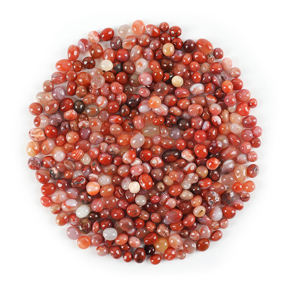 Each stone chip ranges from 10-20mm (approx. 0.39-0.79 inches) and features an irregular tumbled shape with smooth, polished surfaces portraying beautiful reddish to orange hues with natural veining.