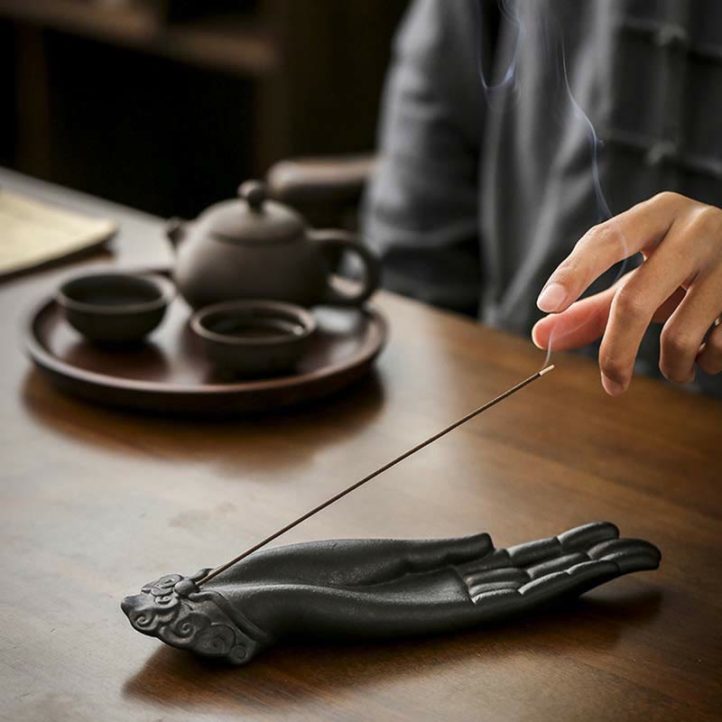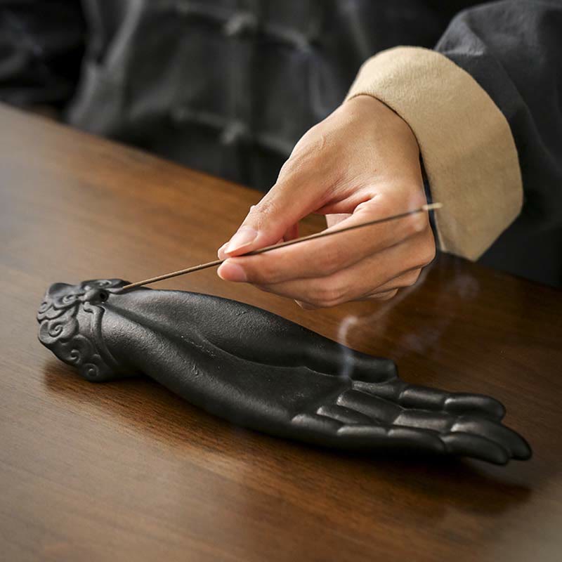 This burner features a Buddha hand among auspicious clouds, symbolizing blessings and protection. Burning incense here helps invite tranquility, positive energy, and spiritual reverence into your space.