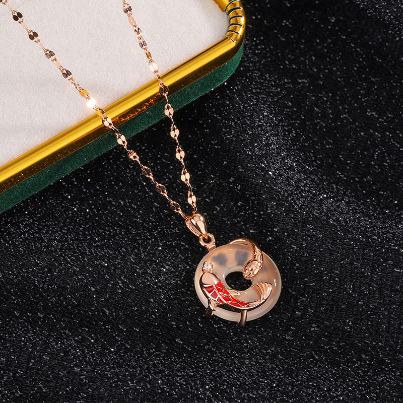 Dieser Anhänger aus echtem Chalcedon und mit einem detailreichen Koi-Fisch-Motiv verziert, steht für Fülle und Entschlossenheit. Das ikonische Peace-Schnallen-Design verstärkt seine spirituelle Bedeutung und macht ihn nicht nur zu einem schönen Accessoire, sondern auch zu einem bedeutungsvollen Symbol der Harmonie.