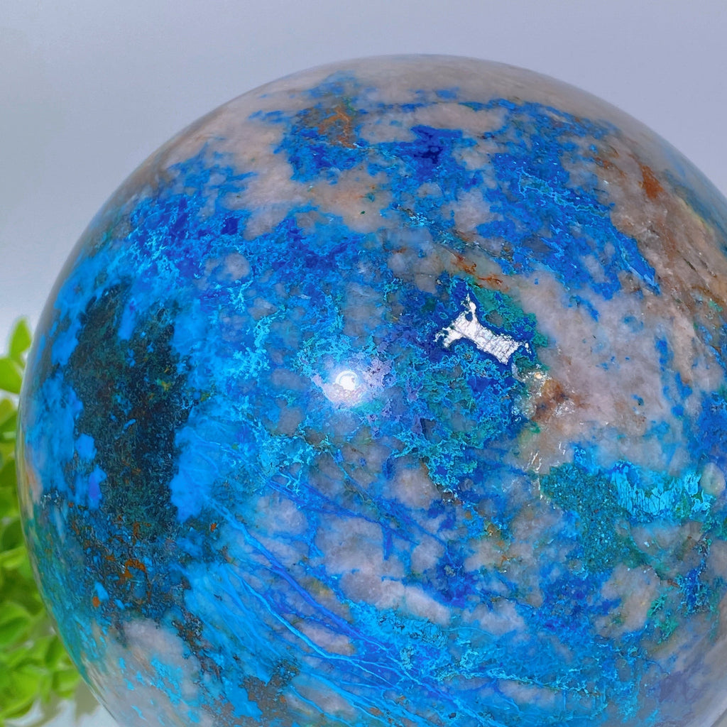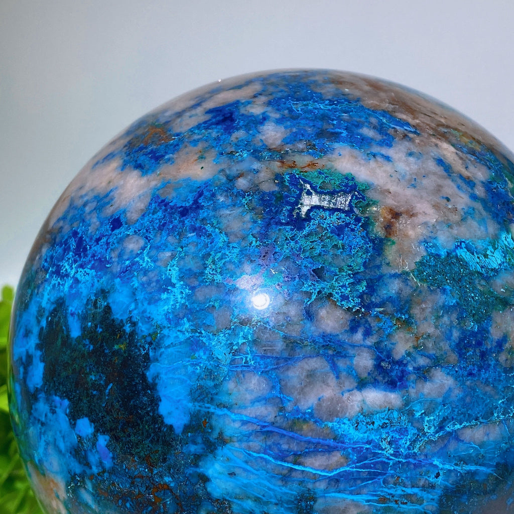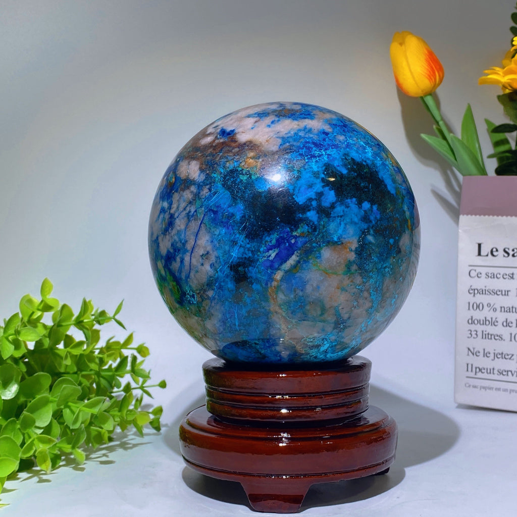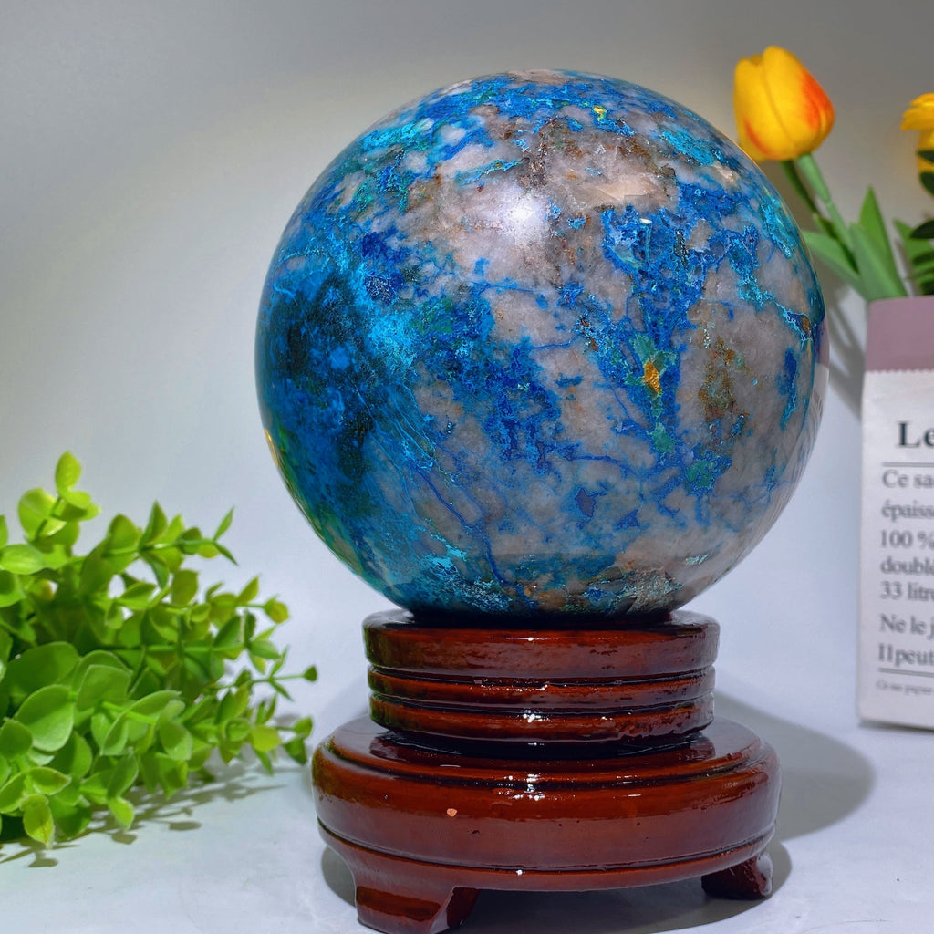 The perfect roundness of a crystal sphere creates a unique energy flow that differs from other crystal shapes. This chrysocolla ball can be used as a powerful intention setting crystal by holding it in your hands while focusing on your desires and aspirations. The weight and substantial size of this piece create a grounding sensation that helps anchor your intentions into reality.