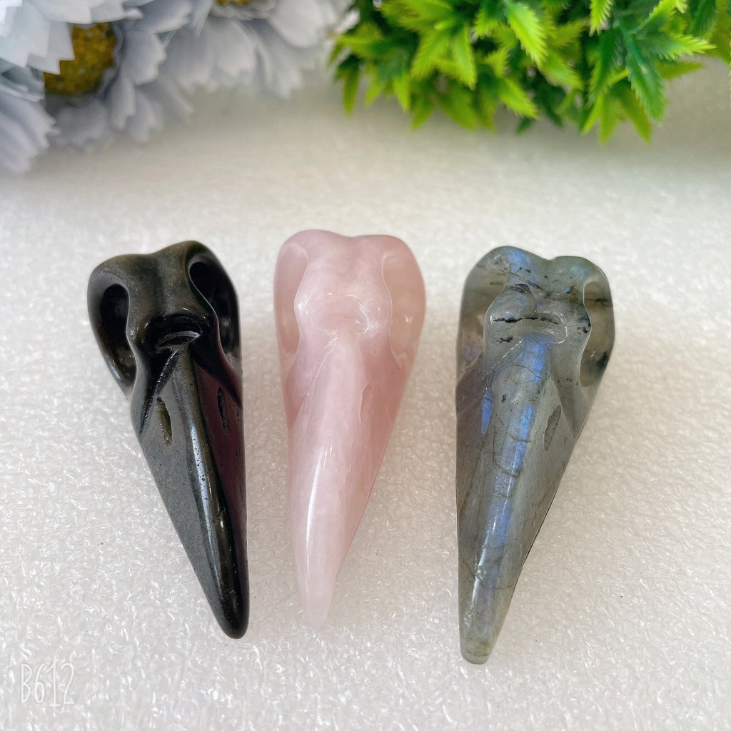 Diese aus goldenem Obsidian , Rosenquarz und Labradorit gefertigten Vogelschädelschnitzereien tragen einzigartige Energien in sich, die Schutz, Liebe und Intuition unterstützen und die Meditation und das spirituelle Bewusstsein verbessern.