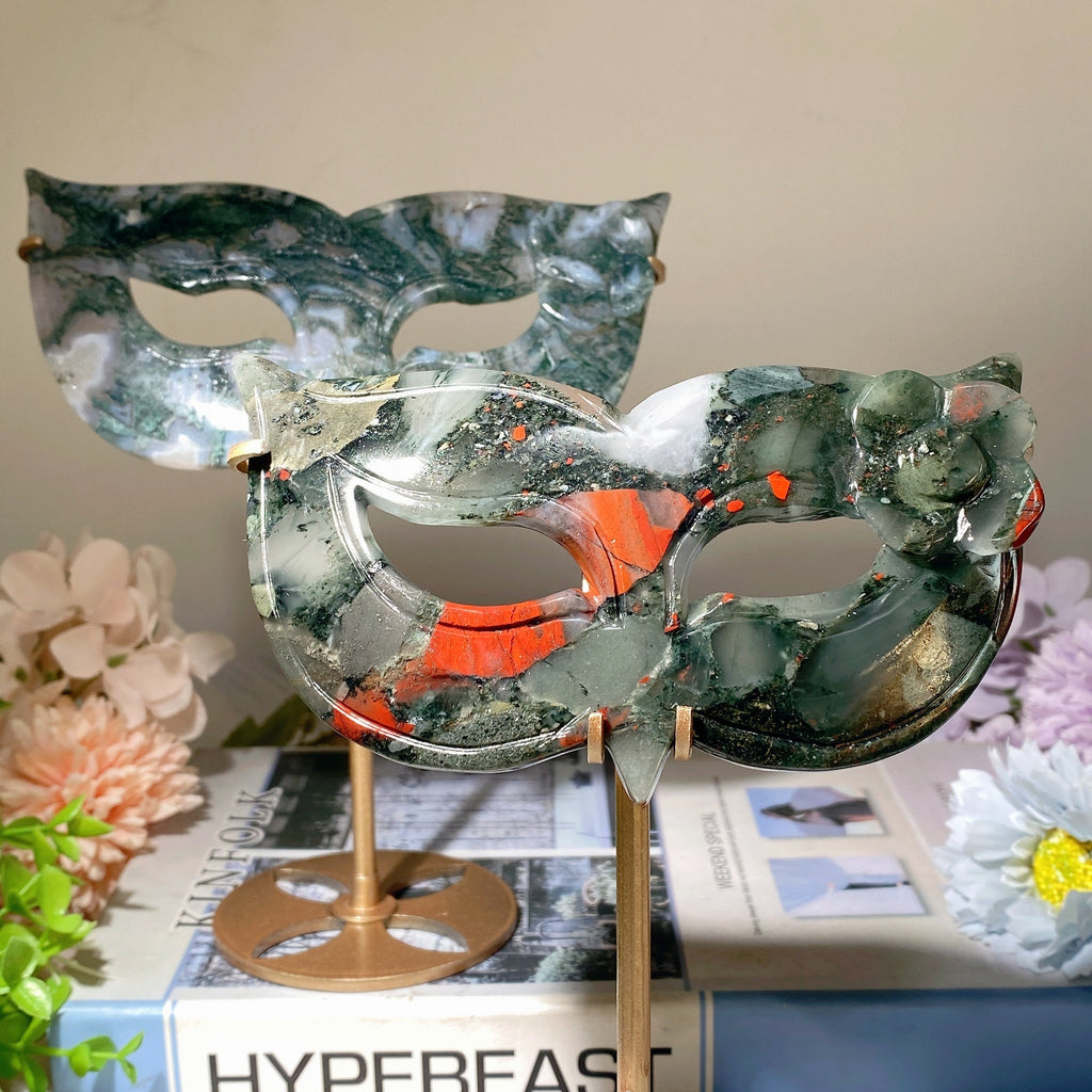 Diese aus Blutstein- und Moosachatkristallen gefertigten Katzenmaskenschnitzereien dienen als kraftvolle spirituelle Totems. Sie fördern Erdungs-, Heilungs- und Schutzenergien und sind somit ideal für die Schaffung einer ausgeglichenen und friedlichen Wohnumgebung.