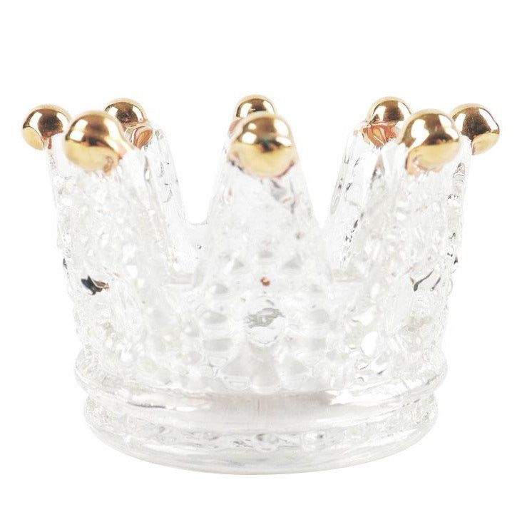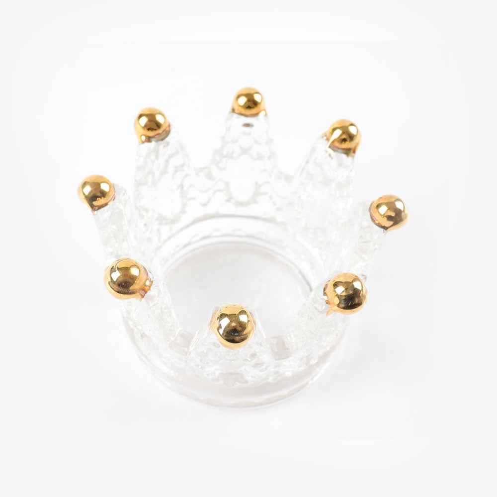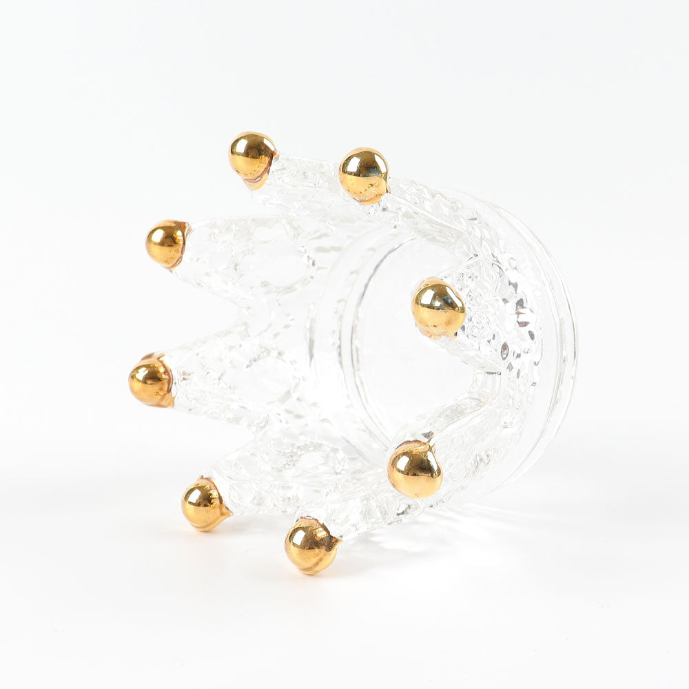 The holder is crafted from transparent crystal glass with a glossy finish and features elegant gold-colored accents atop each conical spike, creating a sophisticated look.