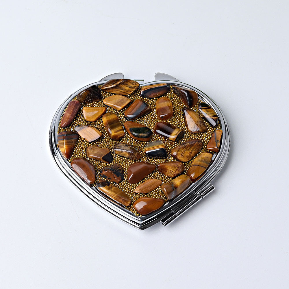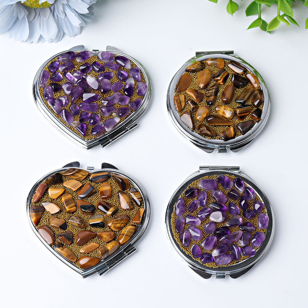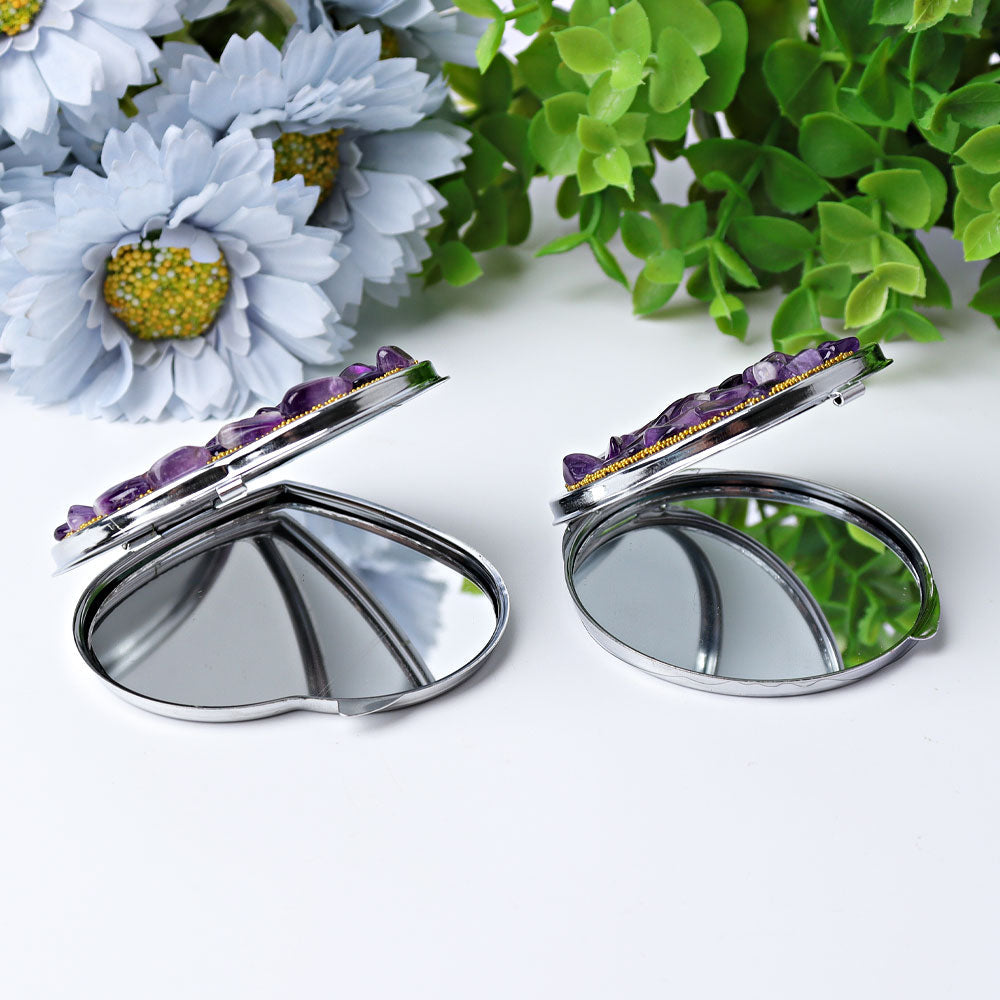 This mirror measures approximately 2.6 inches (approx. 6.6 cm) in the base crystal decoration size. It is offered in heart and round shapes, with the heart variant measuring about 3-4 inches wide (7.6-10.2 cm) and the round variant having a diameter around 4 inches (approx. 10.2 cm).