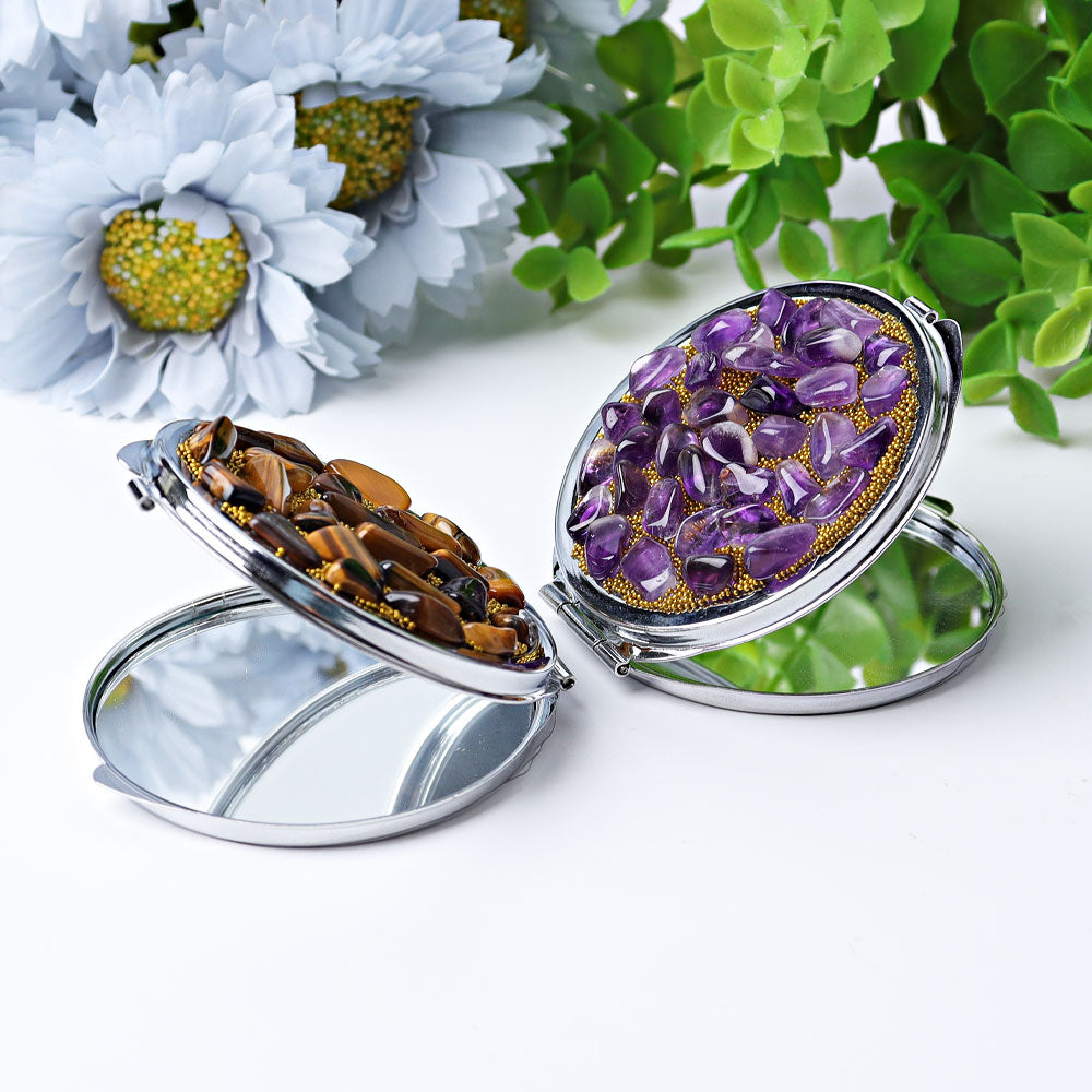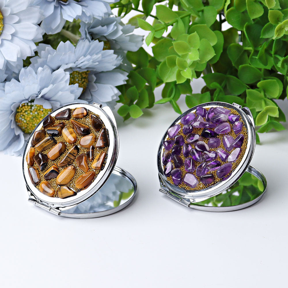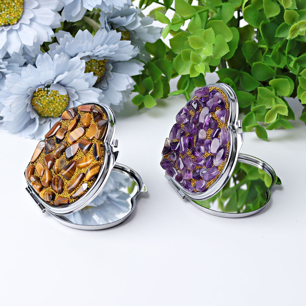 The Amethyst crystal promotes calm, meditation, and spiritual clarity, while Tiger's Eye offers protection, courage, and balance. Together, these stones enhance the mirror’s energetic presence, adding peaceful and grounding vibrations to your space.