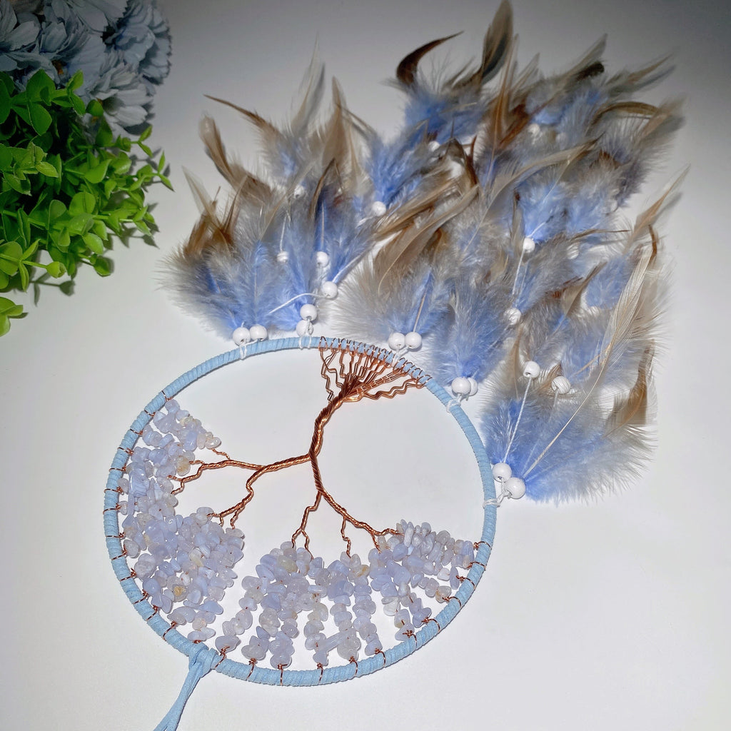 The dreamcatcher features a beautiful combination of Blue Lace Agate, White Moonstone, and smooth polished Obsidian. Each crystal brings unique healing properties to enrich your space.