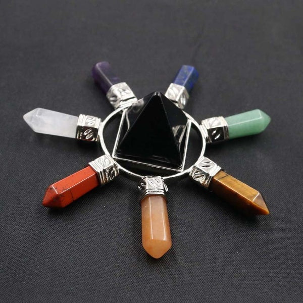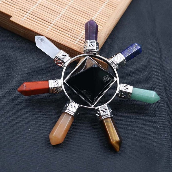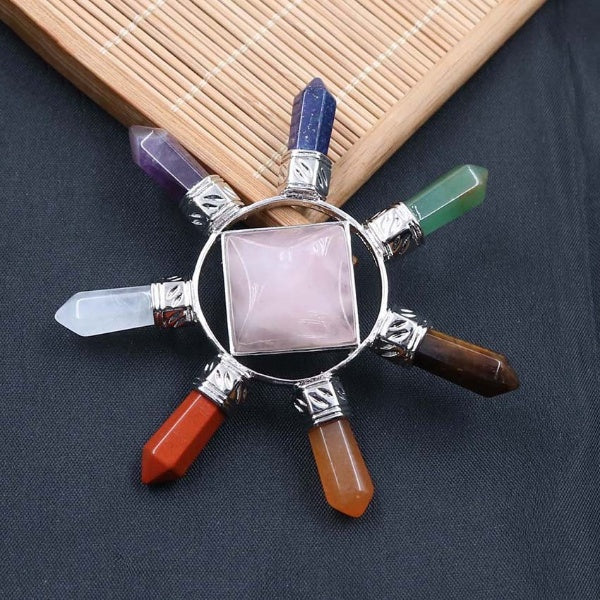 Diese exquisite Kristallpyramide wurde sorgfältig aus sieben Natursteinen gefertigt, von denen jeder ein anderes Chakra repräsentiert.
