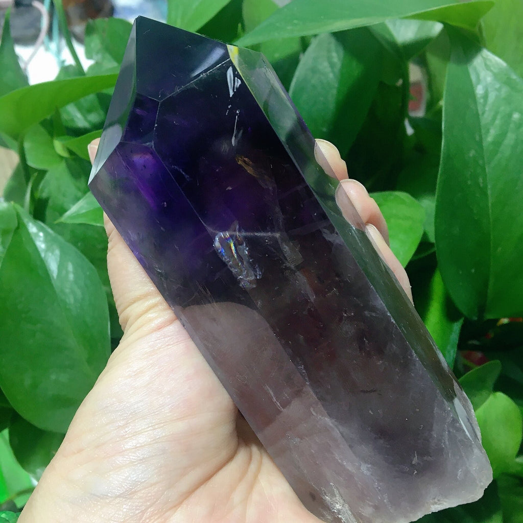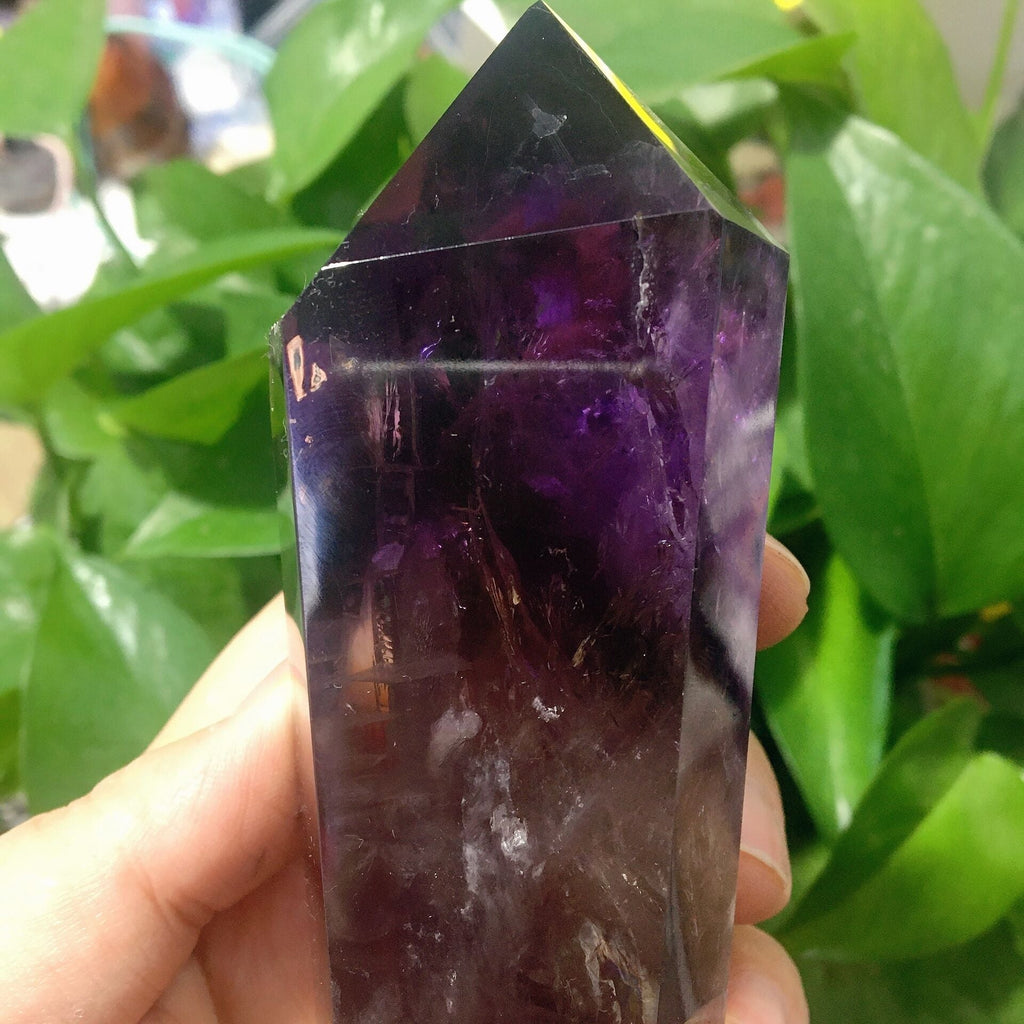 This dark purple amethyst point is renowned for promoting calmness, spiritual growth, and protection. Its half polished finish enhances its natural energy, making it ideal for meditation and healing practices.