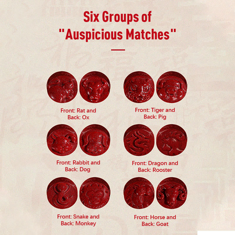 Das Konzept der „glückverheißenden Paarungen“ ist zentraler Bestandteil der chinesischen Zinnoberarmband -Tradition. Es verbindet Sternzeichen, die ihre jeweiligen Stärken gegenseitig verstärken: Drache und Hahn, Ratte und Ochse, Tiger und Schwein, Hase und Hund, Schlange und Affe sowie Pferd und Ziege. Diese Paarungen sollen eine starke energetische Resonanz erzeugen, die verschiedene Aspekte Ihres Lebens verändern kann.