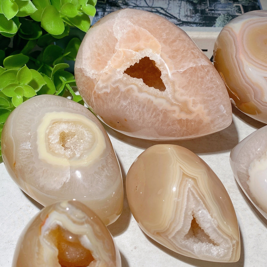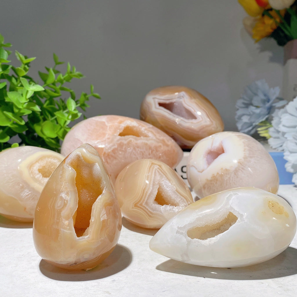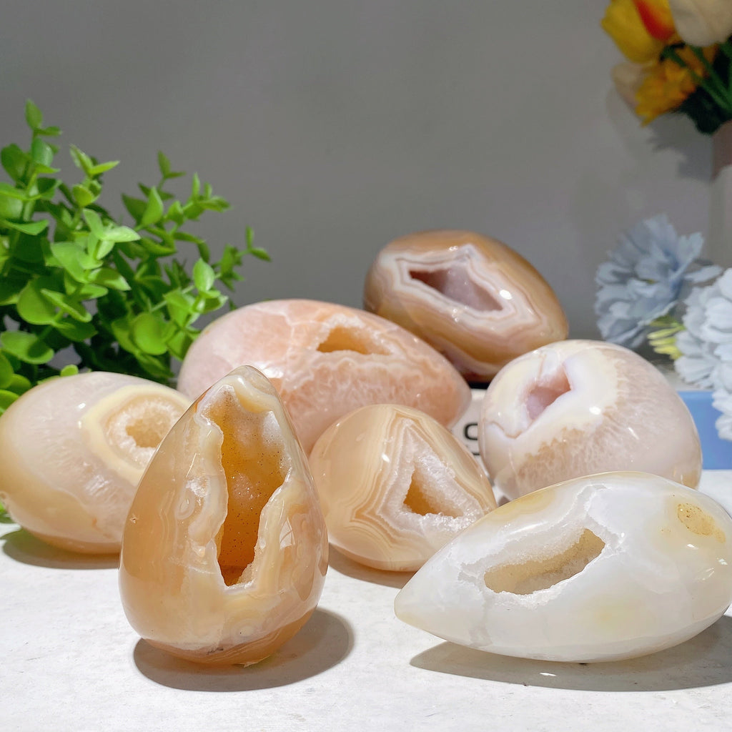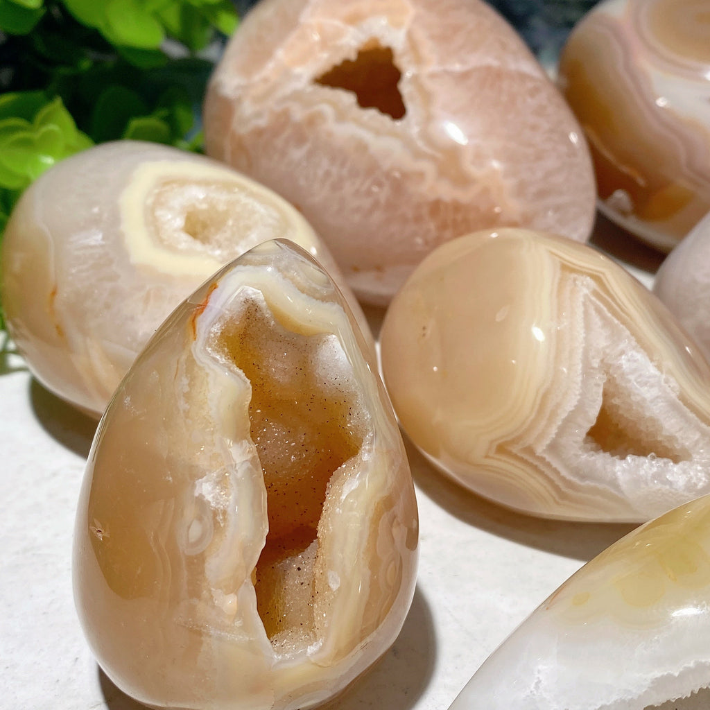 Druzy Agate crystal eggs are known for promoting emotional balance and spiritual growth. Their natural druzy formations enhance energy flow, making them ideal for meditation and healing practices.