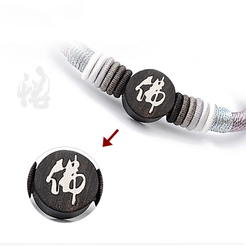Jedes Armband zeigt eine detailreiche Buddha-Figur aus natürlichem Ebenholz, ergänzt durch eine leuchtend rote Schnur, die seit Jahrhunderten in der Tradition buddhistischer Gebetsarmbänder eine wichtige Rolle spielt. Der Kontrast zwischen den tiefen, erdigen Tönen des Ebenholzes und dem energetischen Rot schafft ein optisch beeindruckendes Stück mit tiefer spiritueller Bedeutung.