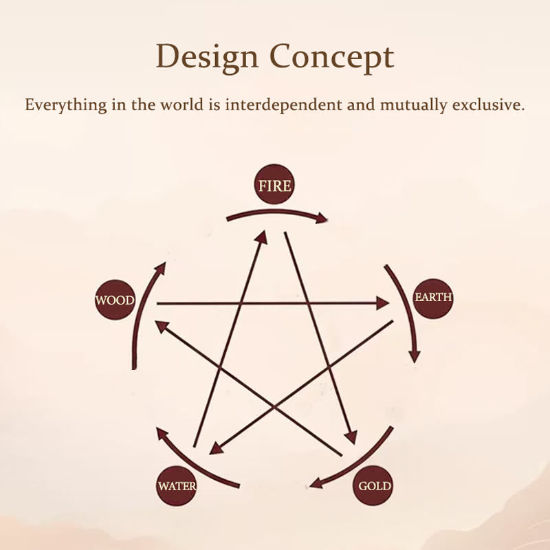 - Colors: Blue, White, Red, Green, Yellow, Black representing Five Elements