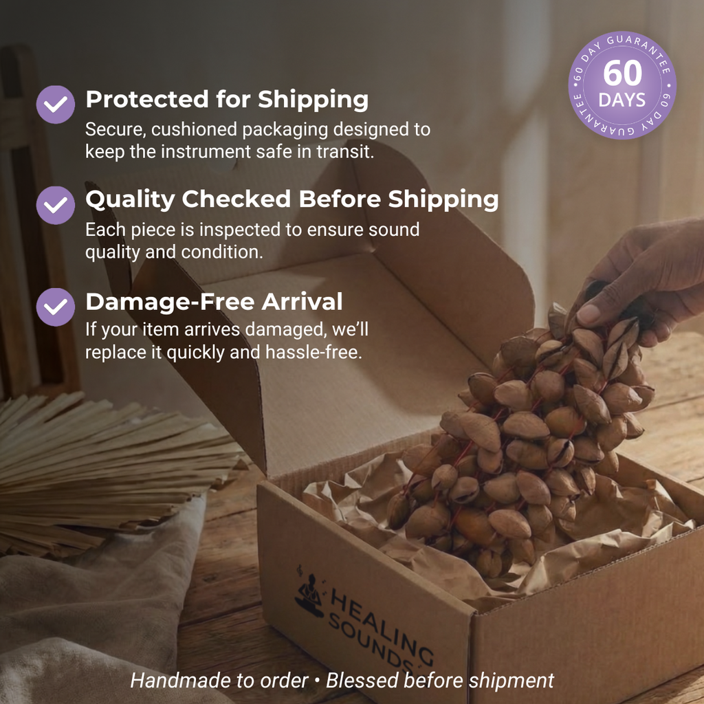 Entdecken Sie die reichen Töne unserer Fruchtschalen-Handglocke , einem einzigartigen Instrument, das in verschiedenen Traditionen geschätzt wird. Diese Samenschalen-Shaker erzeugen eine harmonische Mischung natürlicher Klänge, die Übungen zur Chakra-Balance und spiritueller Achtsamkeit unterstützen. Die beruhigenden Klänge dieses Shakers schaffen eine friedliche Atmosphäre, ideal für Meditation oder ein Klangbad . Integrieren Sie dieses Instrument in Ihre persönliche Praxis und fördern Sie ein Gefühl der Ruhe und Harmonie.