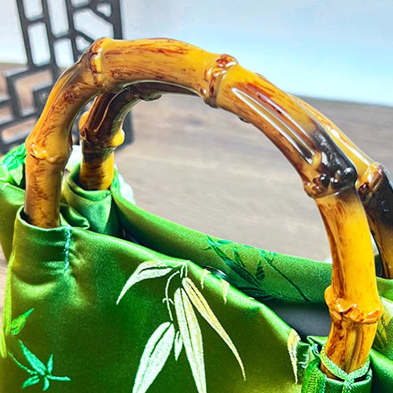 Die Tasche besteht aus strapazierfähigem Polyester-Baumwollgewebe und ist mit natürlich wirkenden Bambusgriffen und Perlen verziert. Alle Materialien sind von Natur aus umweltfreundlich und spiegeln unser Engagement für Nachhaltigkeit und Qualität wider.