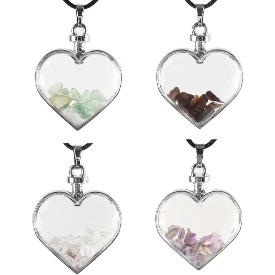 This heart shaped crystal pendant carries healing properties from the natural stones it includes. Depending on the variant, it can promote luck, health, beauty, and energy balance, helping your spiritual journey and emotional wellbeing.