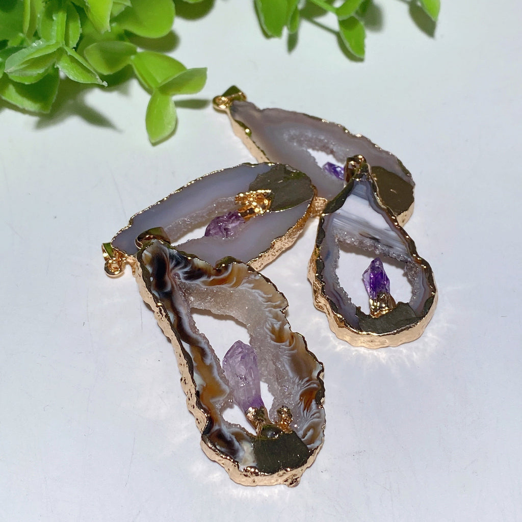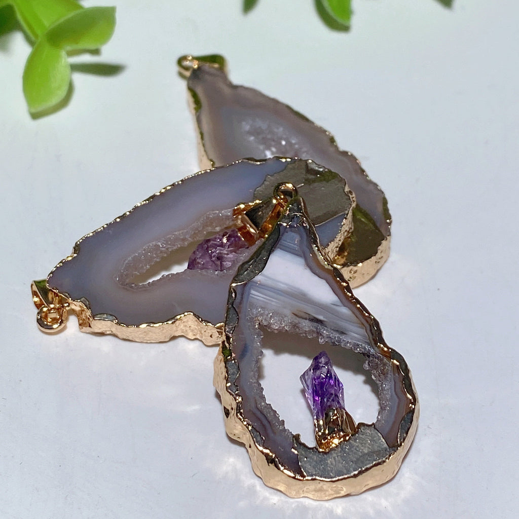 Dieser einzigartige Anhänger besteht aus Amethyst und Achat , die für ihre beruhigende Energie bekannt sind und emotionales Gleichgewicht und spirituelle Heilung fördern. Das Tragen kann die Meditation fördern und den Frieden fördern.