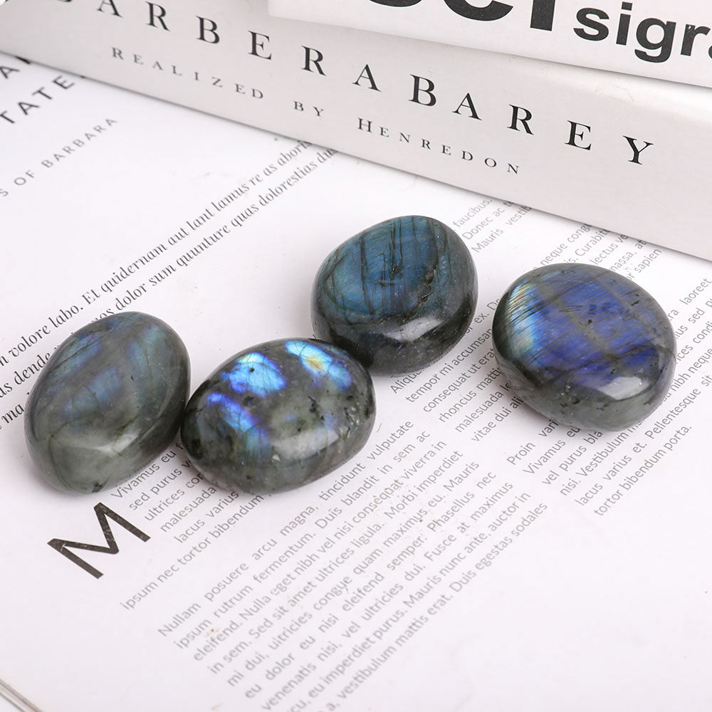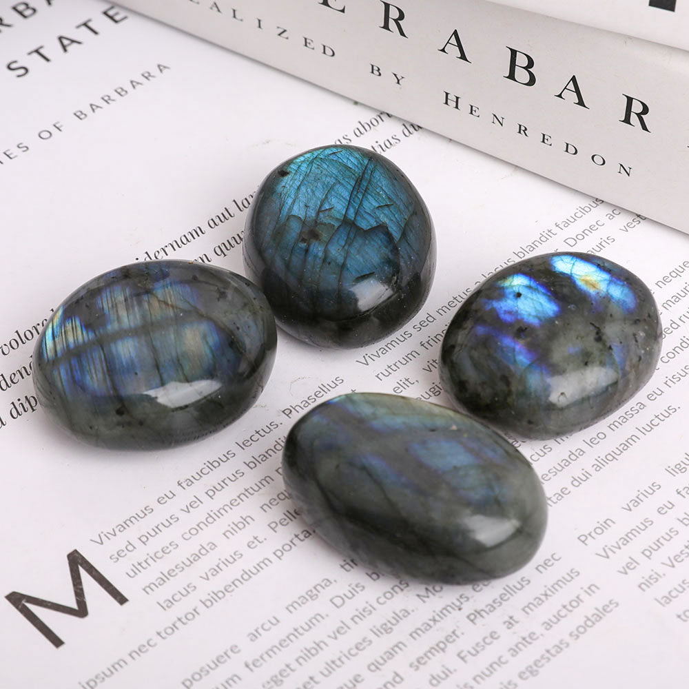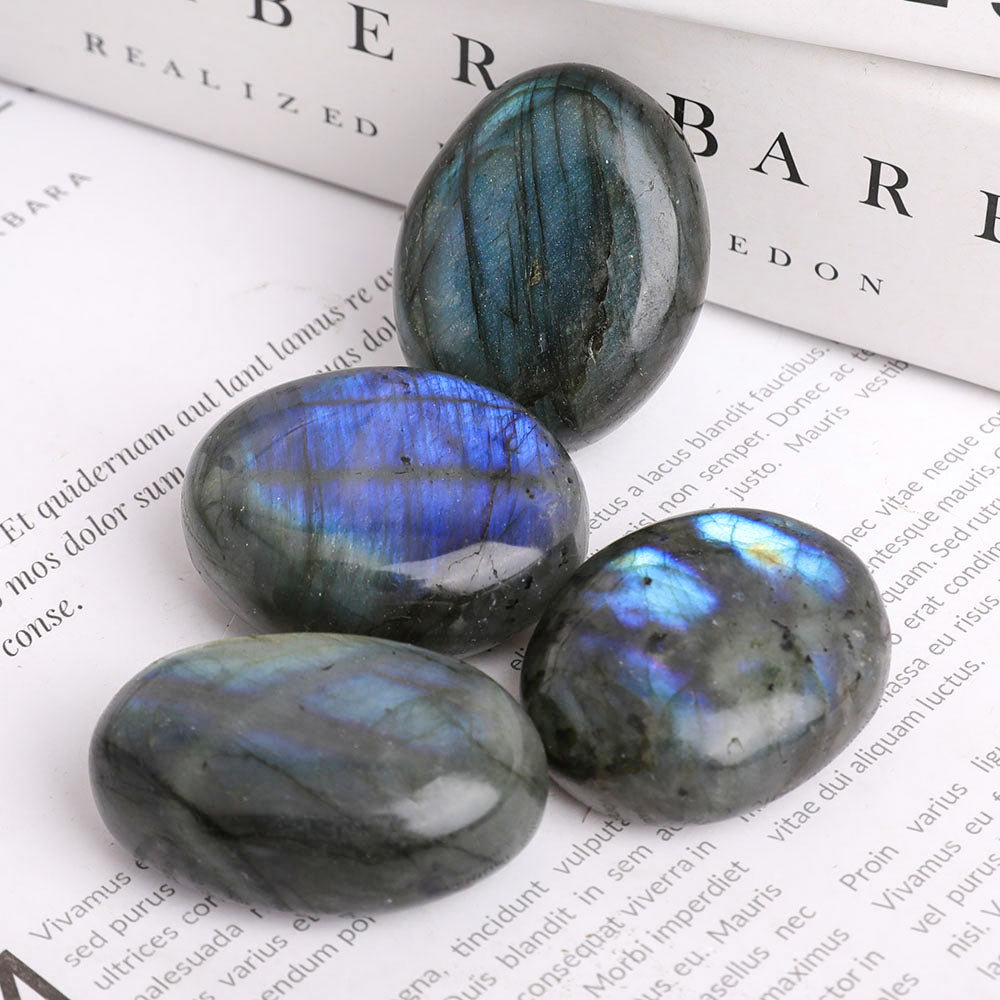 The labradorite palm stone is renowned for its powerful energy healing properties. It enhances intuition, protects against negative energy, and supports transformation. The stone's iridescent blues and greens stimulate spiritual growth and calm the mind during meditation.