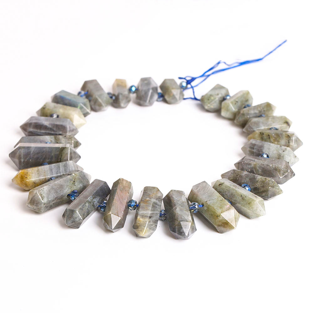 Jede polierte Labradorit- Kristallspitze wird sorgfältig ausgewählt und auf eine passende dunkelblaue Schnur aufgefädelt, wodurch ein vielseitiger 42 cm langer Strang entsteht, der als perfekte Grundlage für Ihre individuellen Schmuckkreationen zum Ausgleich der Chakren dient.