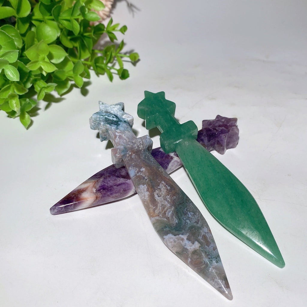 These crystal swords are crafted for healing and energetic balance, promoting spiritual growth, clarity, protection, and emotional calm. Their unique stone energies support meditation and enhance positive vibes in your space.