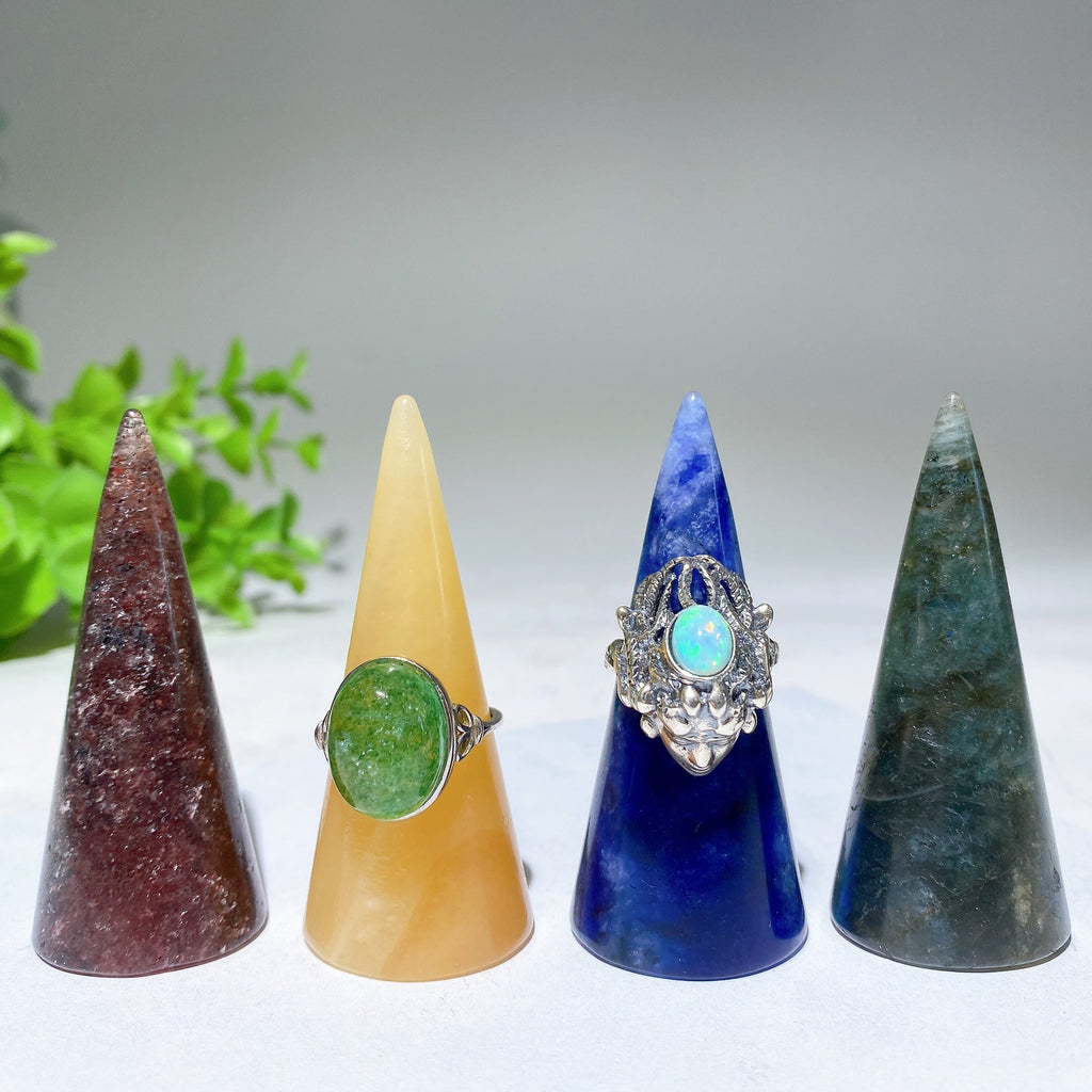 These mixed crystal stands offer a beautiful way to showcase your rings while enhancing your space's energy. The combination of strawberry quartz, labradorite, sodalite, and orange calcite supports healing, spiritual clarity, and positive vibrations, making them perfect for meditation and home decor.