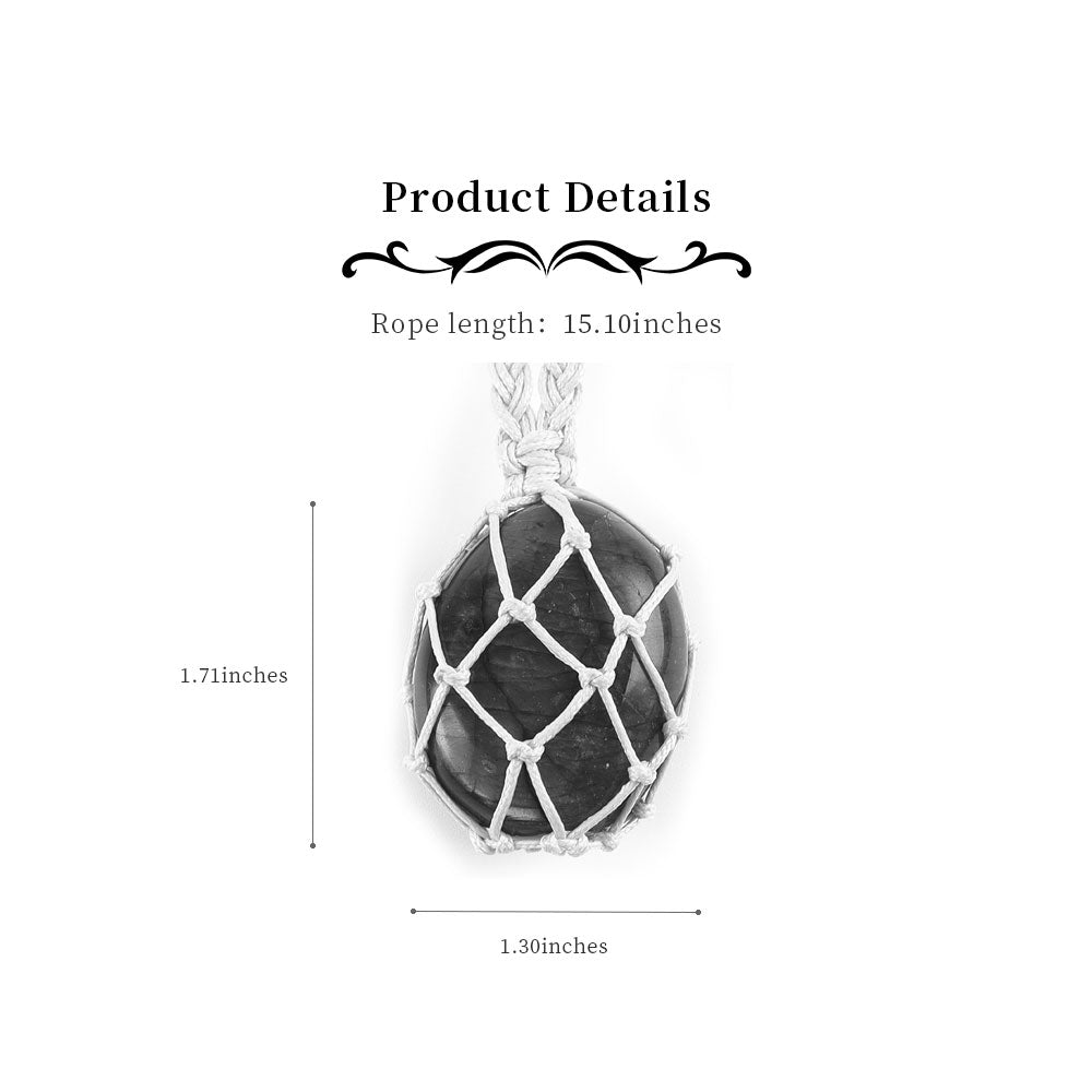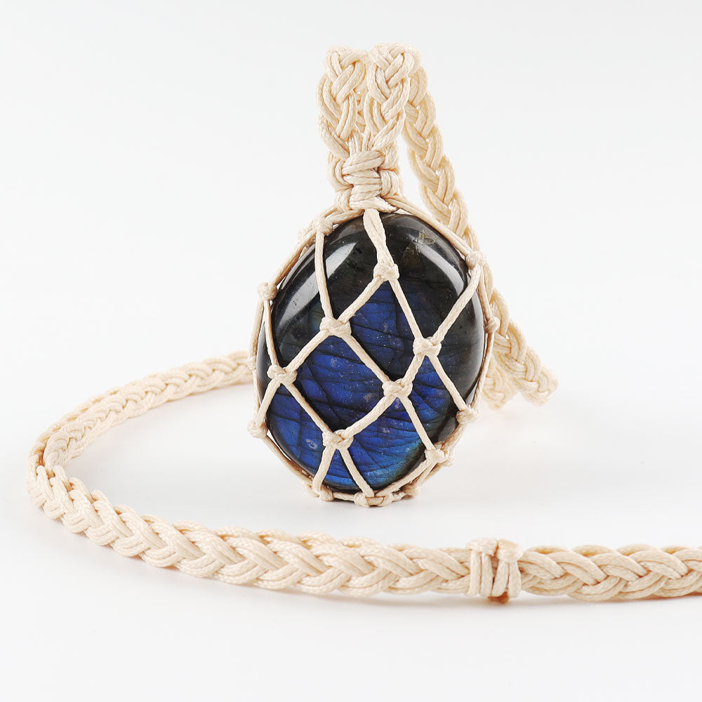 Measuring 1.3 x 1.71 inches (approx. 3.3 x 4.3 cm), this natural labradorite crystal is expertly wrapped in a delicate cream-colored cord that forms an intricate net-like structure. The combination of the polished semi-transparent stone and artisanal wrapping creates a distinctive piece that stands out in any collection of spiritual protection jewelry.