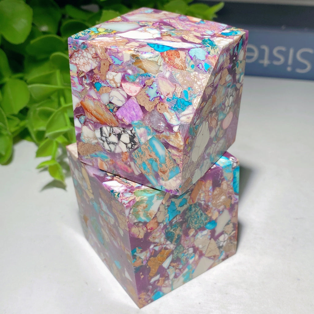Discover the captivating energy of our 1.6 Inch Natural Turquoise Chip Cube, a mesmerizing addition to any crystal cubes collection. This beautifully crafted geometric treasure combines the ancient wisdom of turquoise with the stable, grounding energy of the cube form. Each piece showcases nature's artistry through a vibrant mosaic of genuine turquoise chips carefully assembled into a perfect cubic structure.