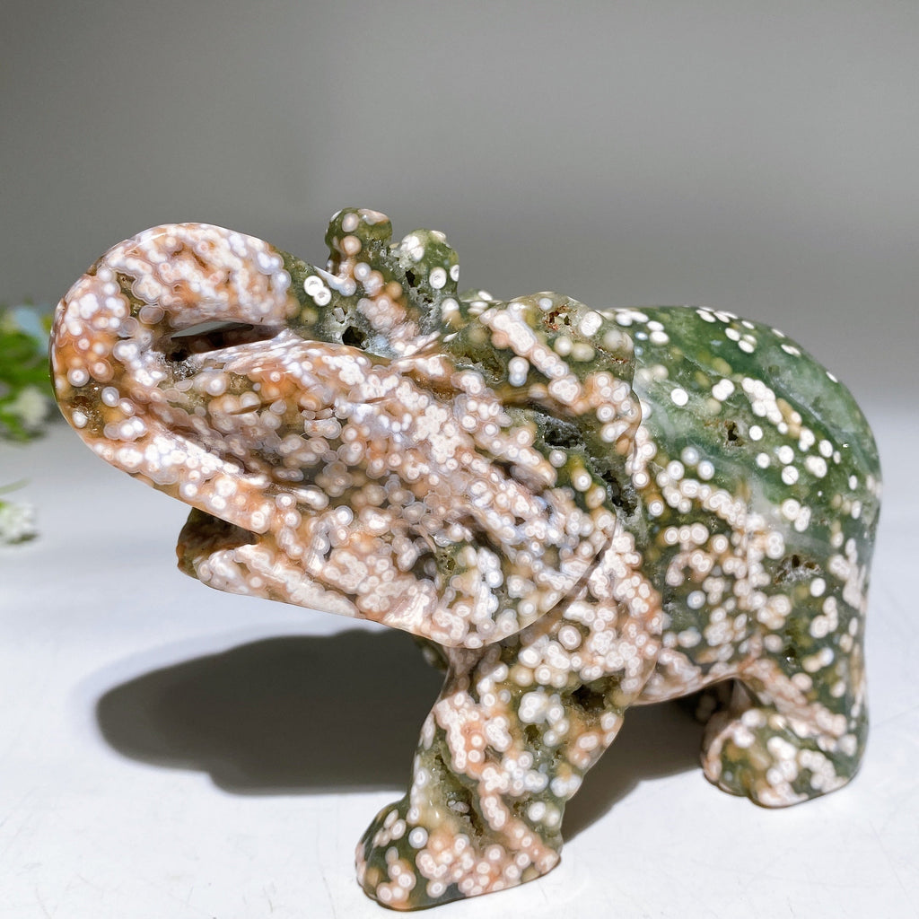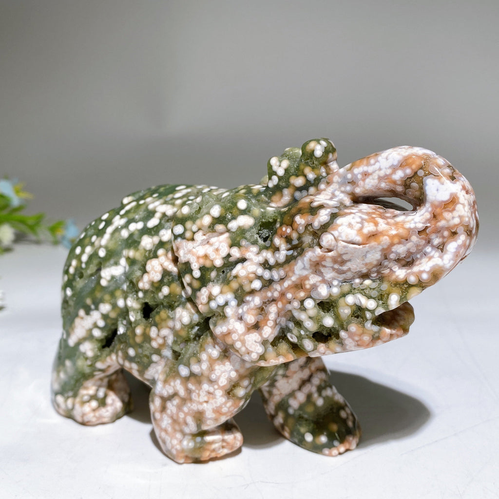 The ocean jasper elephant symbolizes wisdom, emotional healing, and energy cleansing. Its smooth carved form helps bring balance and peace into your space, fostering positive energy flow.